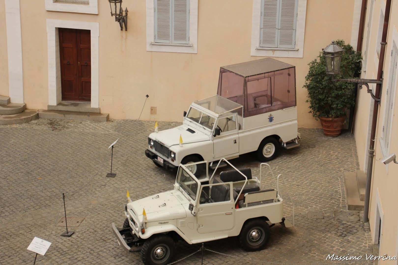 Affacciandomi alla finestra del primo piano, ecco le papa mobili, quelle simpatiche macchinine con cui i vari Papi si sono spostati rimanendo protetti in caso di attentati, anche in questo caso mezzi creati appositamente per loro…
