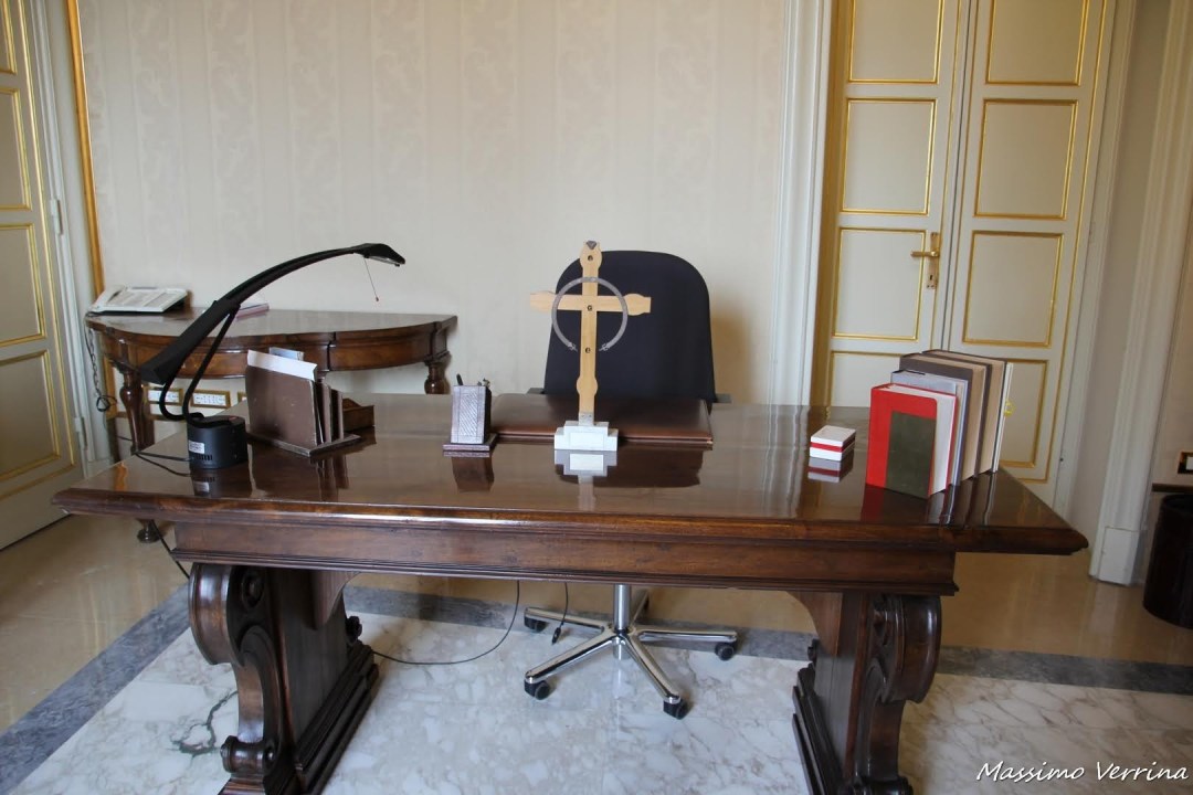 Stiamo arrivando al termine di questa narrazione che oltre al borgo vi ha fatto conoscere la meraviglia dei giardini Pontifici e ora, con le ultime puntate la bellezza del suo Palazzo. Siamo giunti in questo percorso di visita a quella che è un po’ l’intimità del Pontefice, o meglio dei vari Pontefici che qua si sono avvicendati. Ecco una scrivania dove scrivere i testi da leggere, o semplicemente dove riflettere e pensare, è un po’ un salotto personale, dove gli arredi d’epoca danno un’immagine ancora più storica a queste sale…