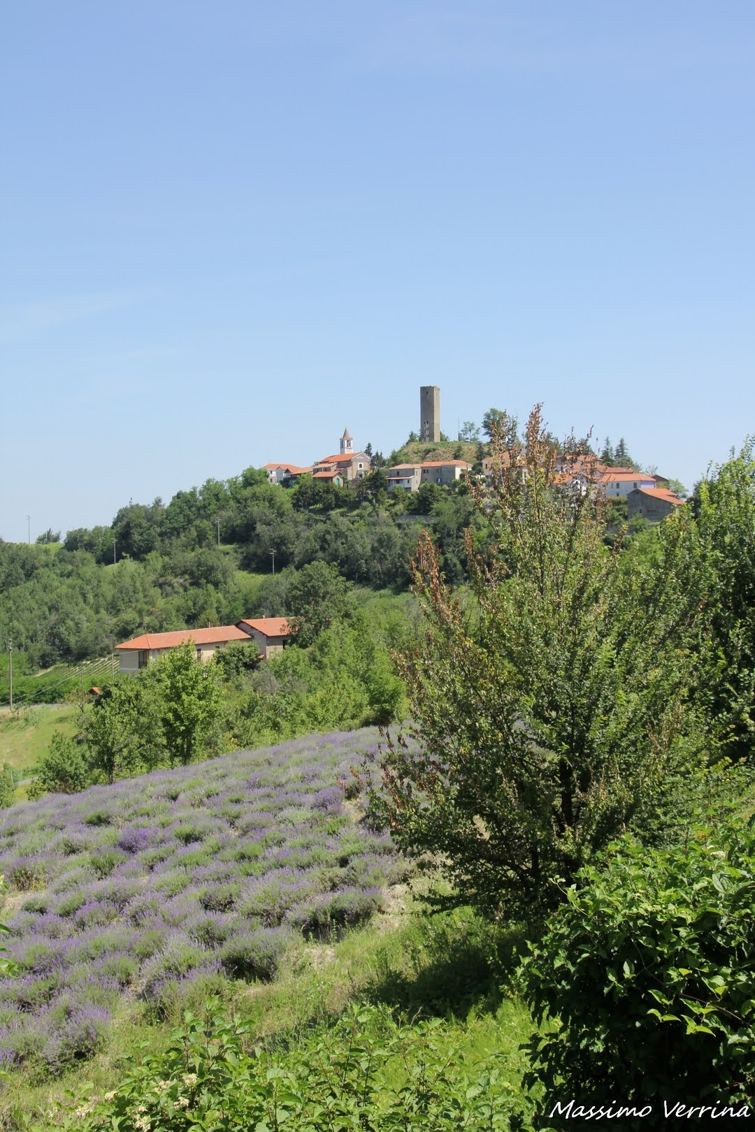 Ecco come si vede il piccolo borgo che abbiamo appena visitato e la sua torre dai campi di lavanda, come vedete in questa parte di territorio è il verde a prevalere, oltre ai bellissimi campi di lavanda nei quali ci troviamo…