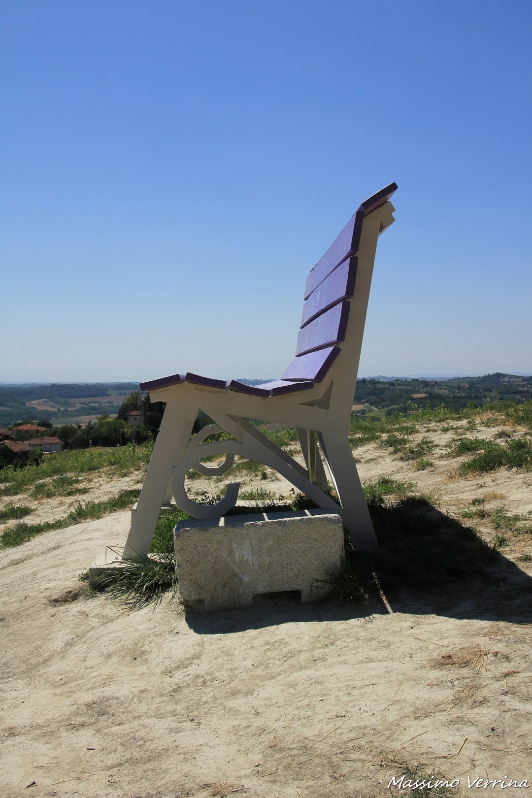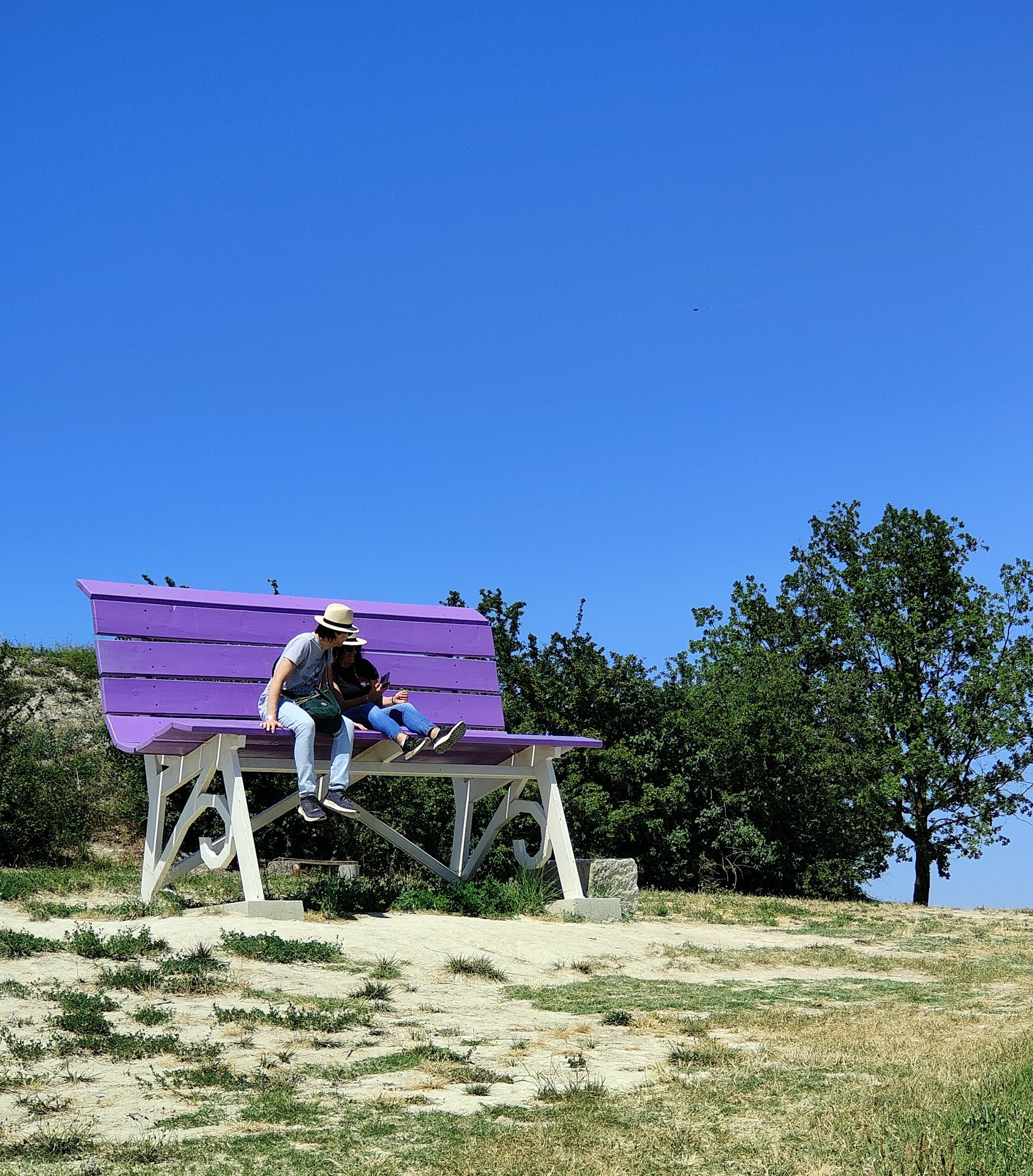 Dopo aver ammirato i paesaggi delle varie colline ricoperte di lavanda e non solo, questa puntata è dedicata alla panchina gigante, eccola che spunta alla nostra vista dopo un’ultima curva del sentiero. Ci sono persone, che mi serviranno per le proporzioni e per scatti veramente notevoli….