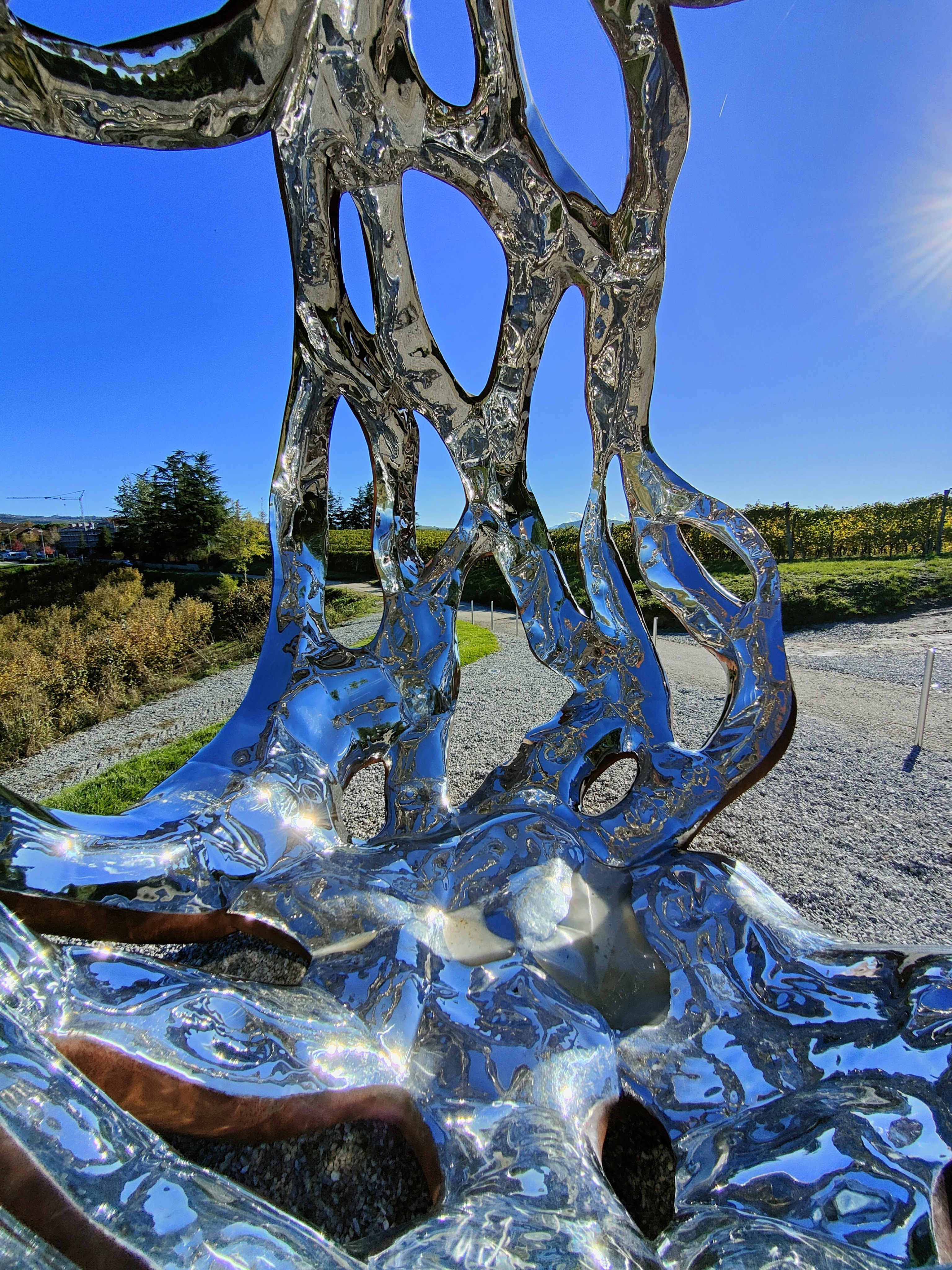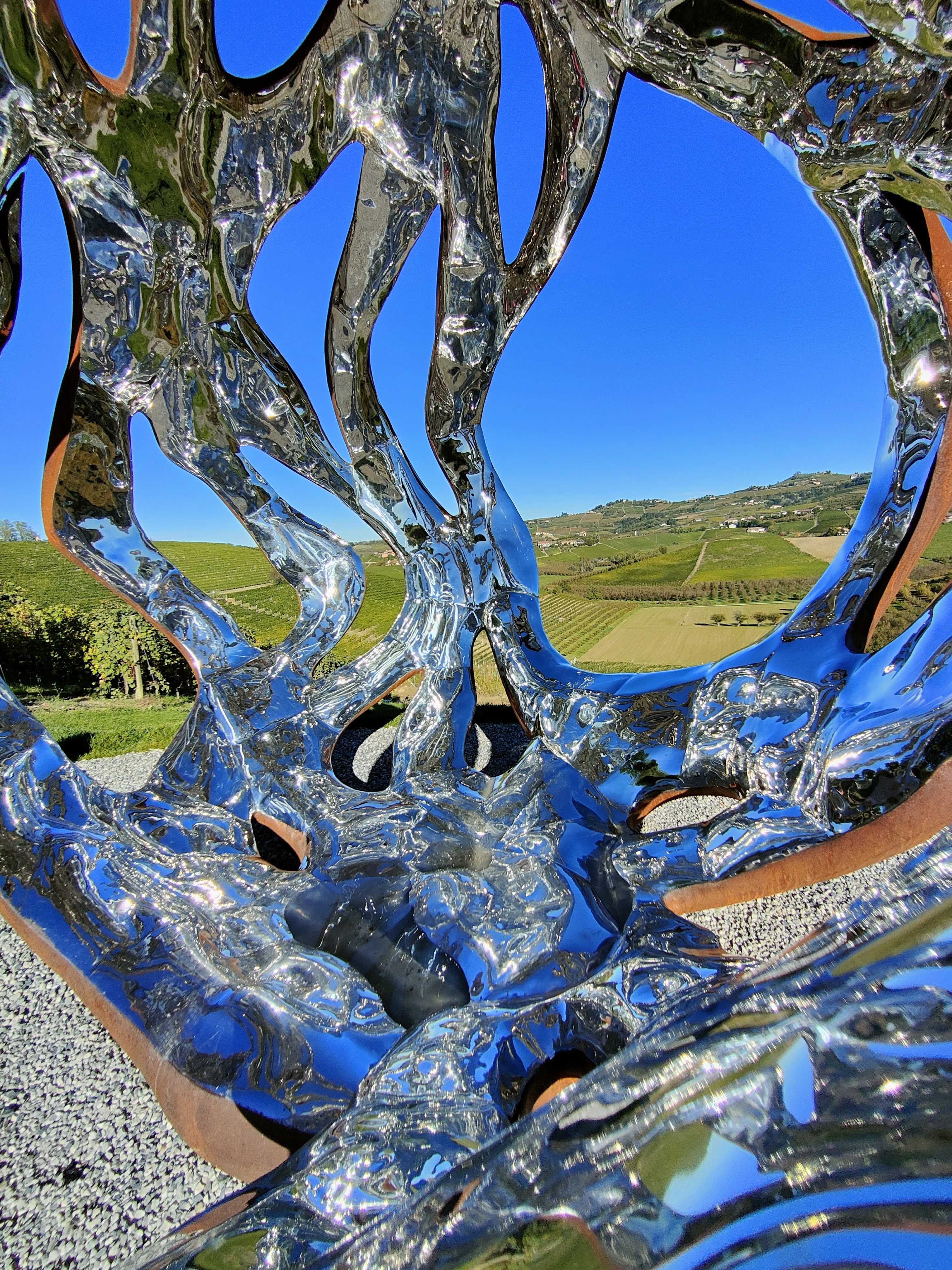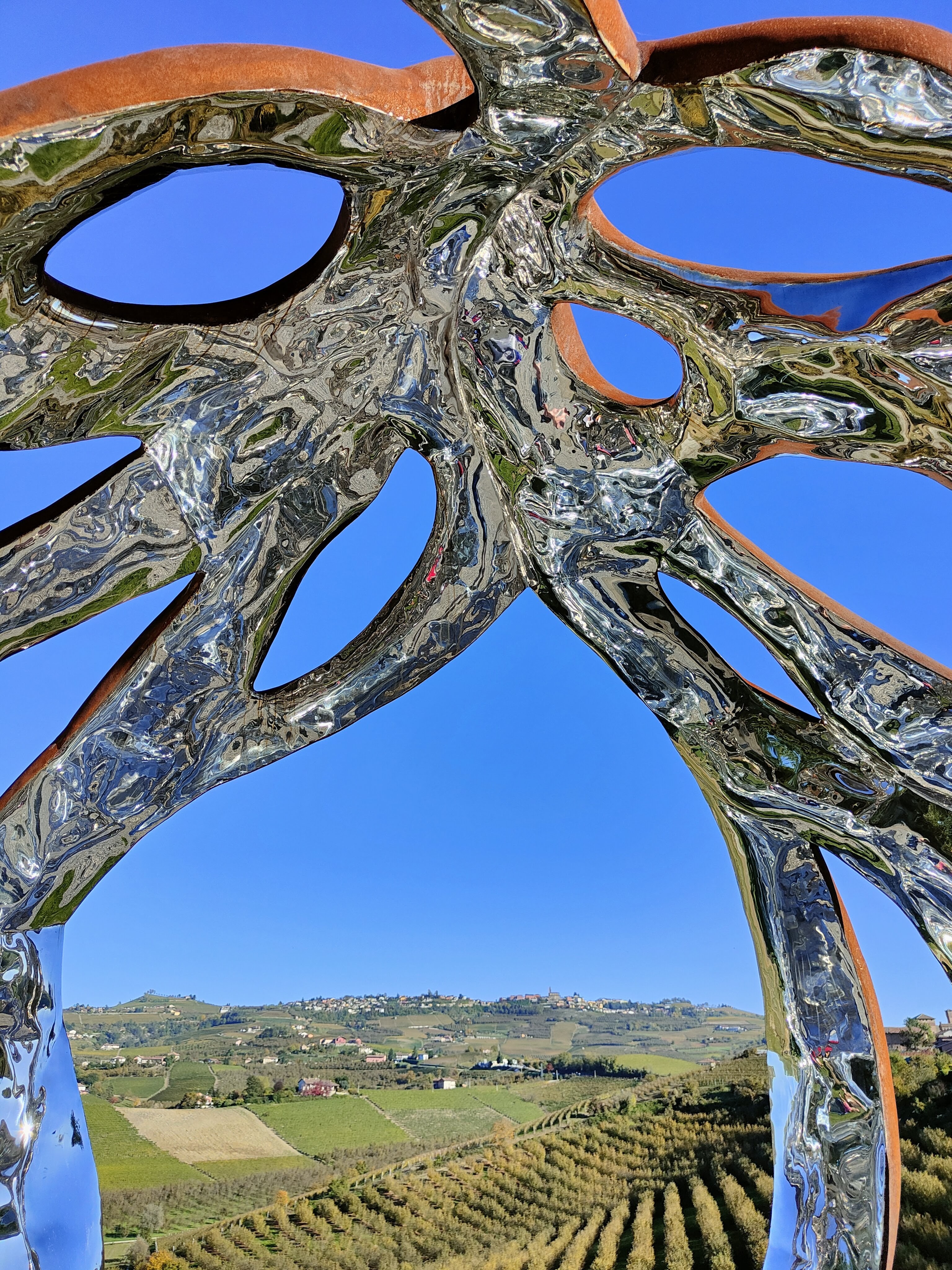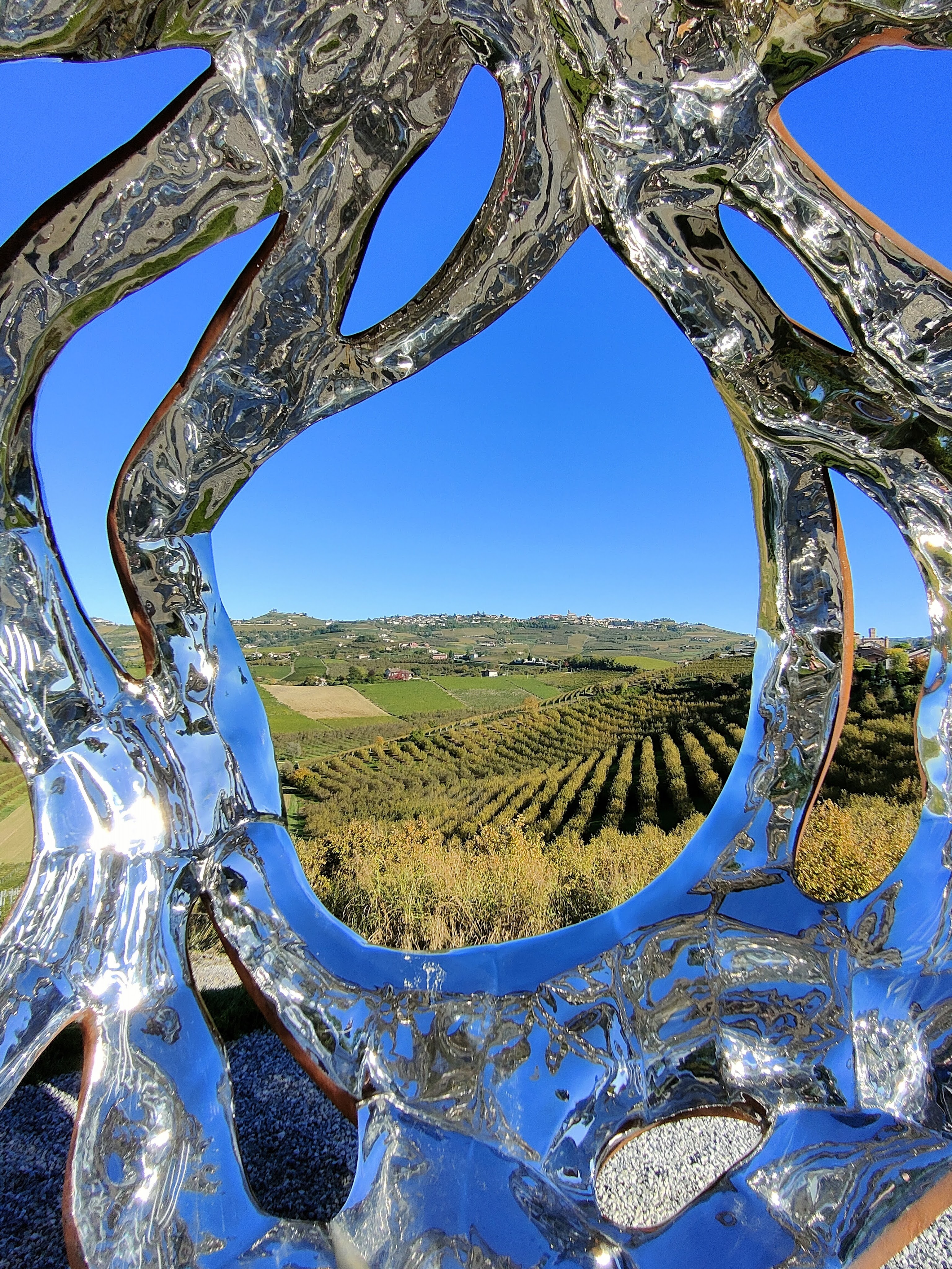 Eh si perché la particolarità di questa installazione è anche dovuta al punto dove è stata posizionata, un bellissimo belvedere affacciato sui vigneti, che nelle giornate di sole come quella in cui ho scattato queste immagini, si riflettono a sua volta al suo interno…