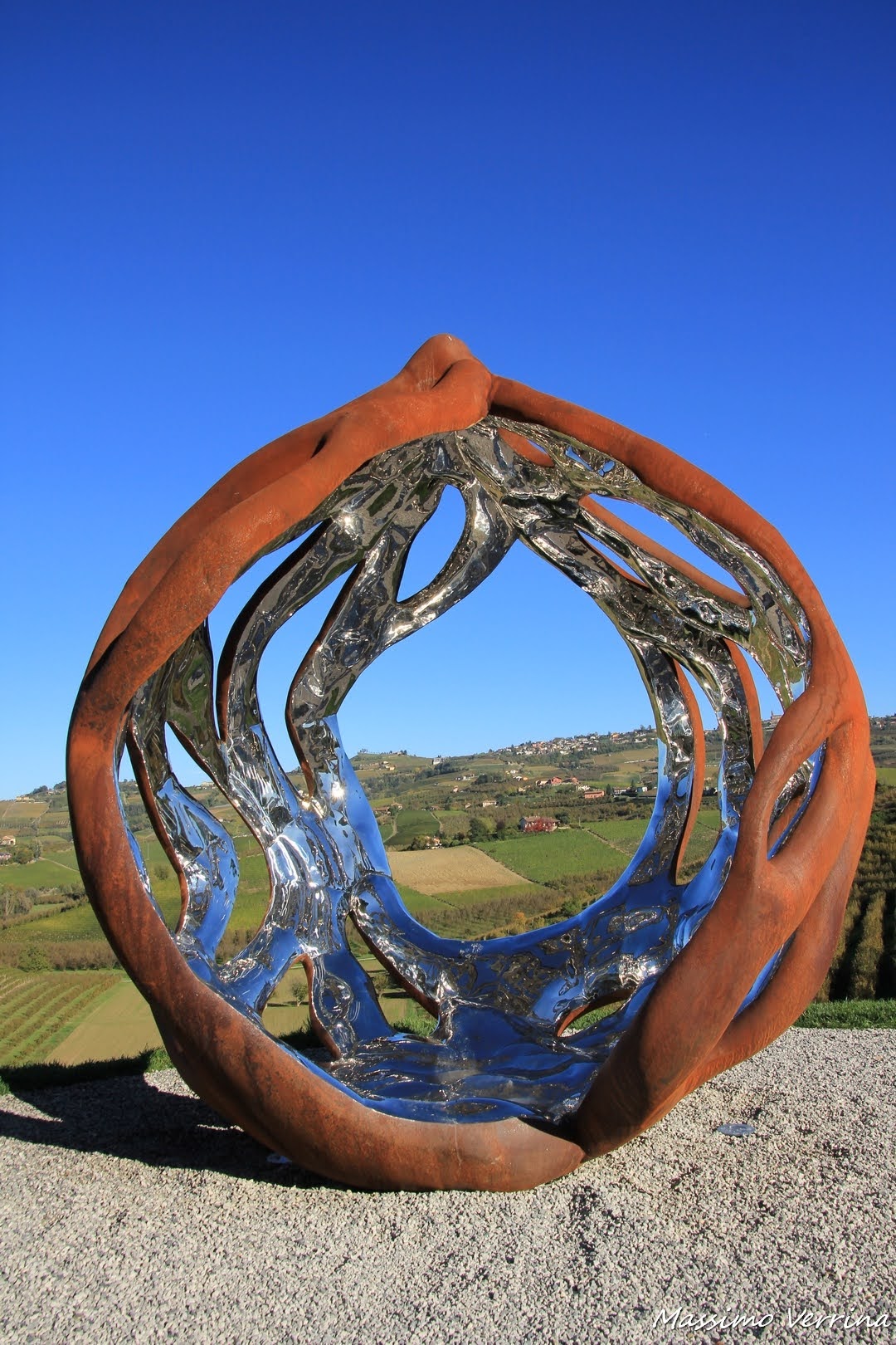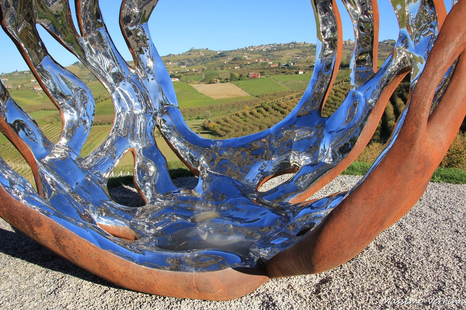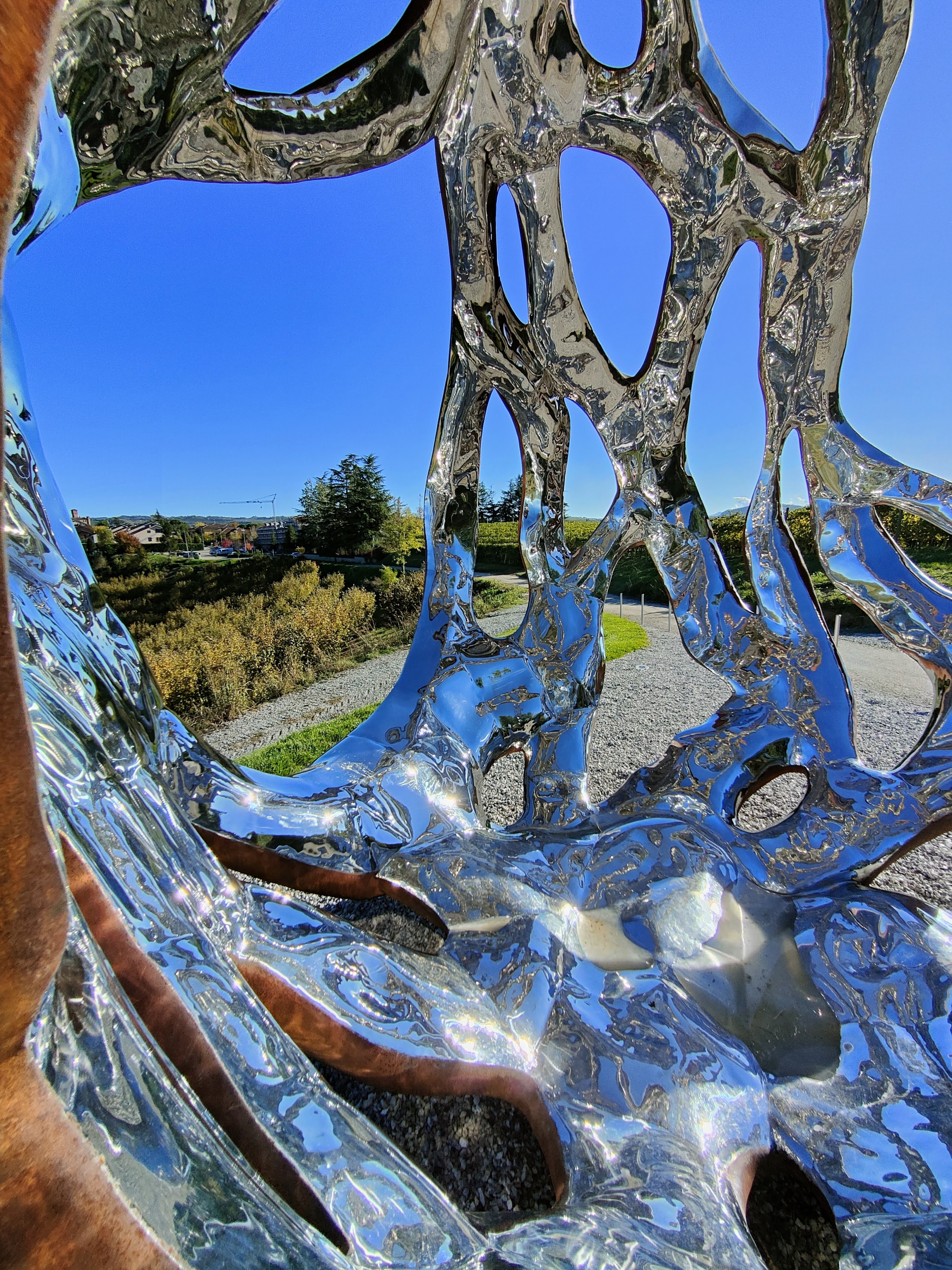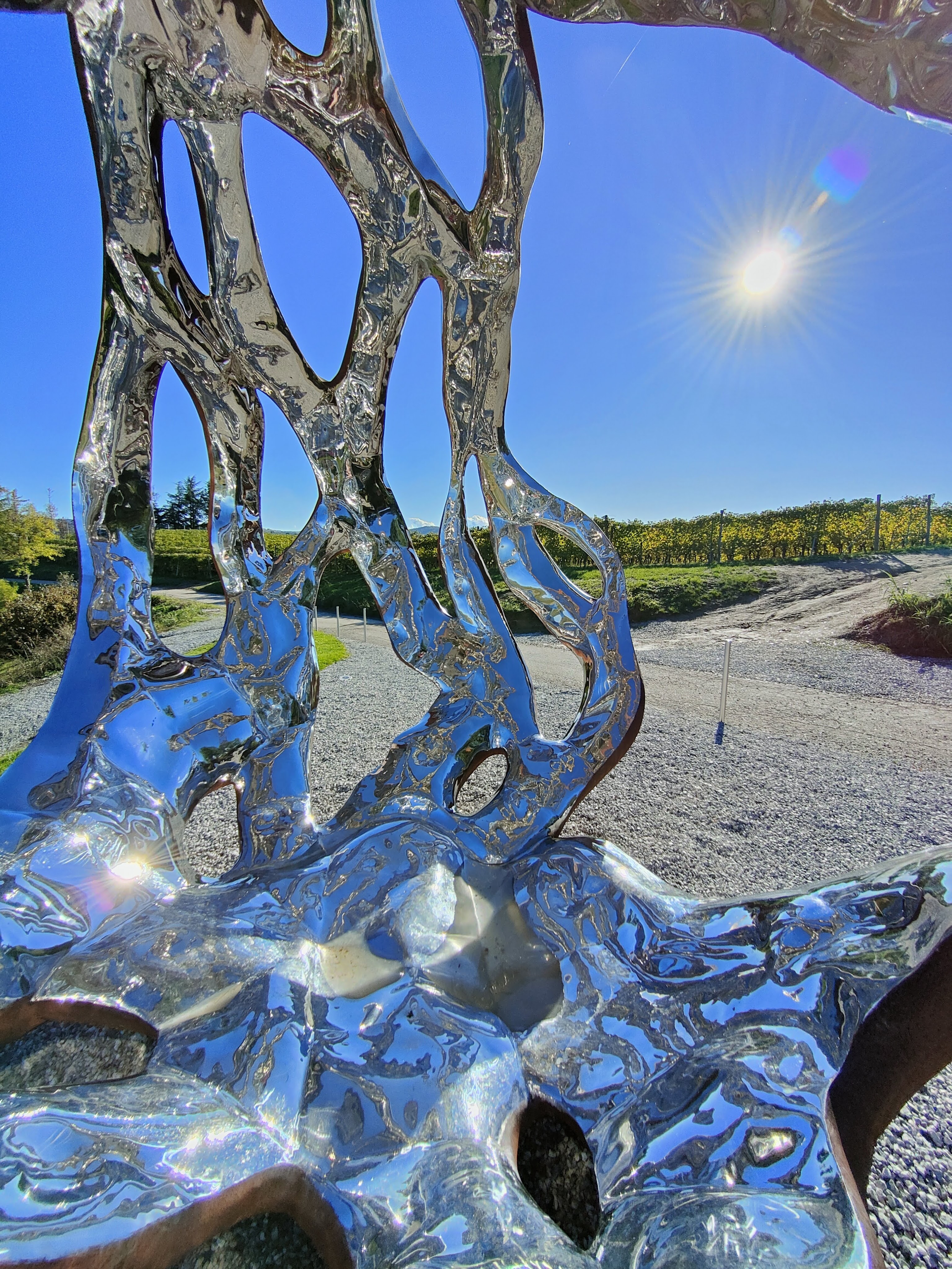 Eh si perché la particolarità di questa installazione è anche dovuta al punto dove è stata posizionata, un bellissimo belvedere affacciato sui vigneti, che nelle giornate di sole come quella in cui ho scattato queste immagini, si riflettono a sua volta al suo interno…