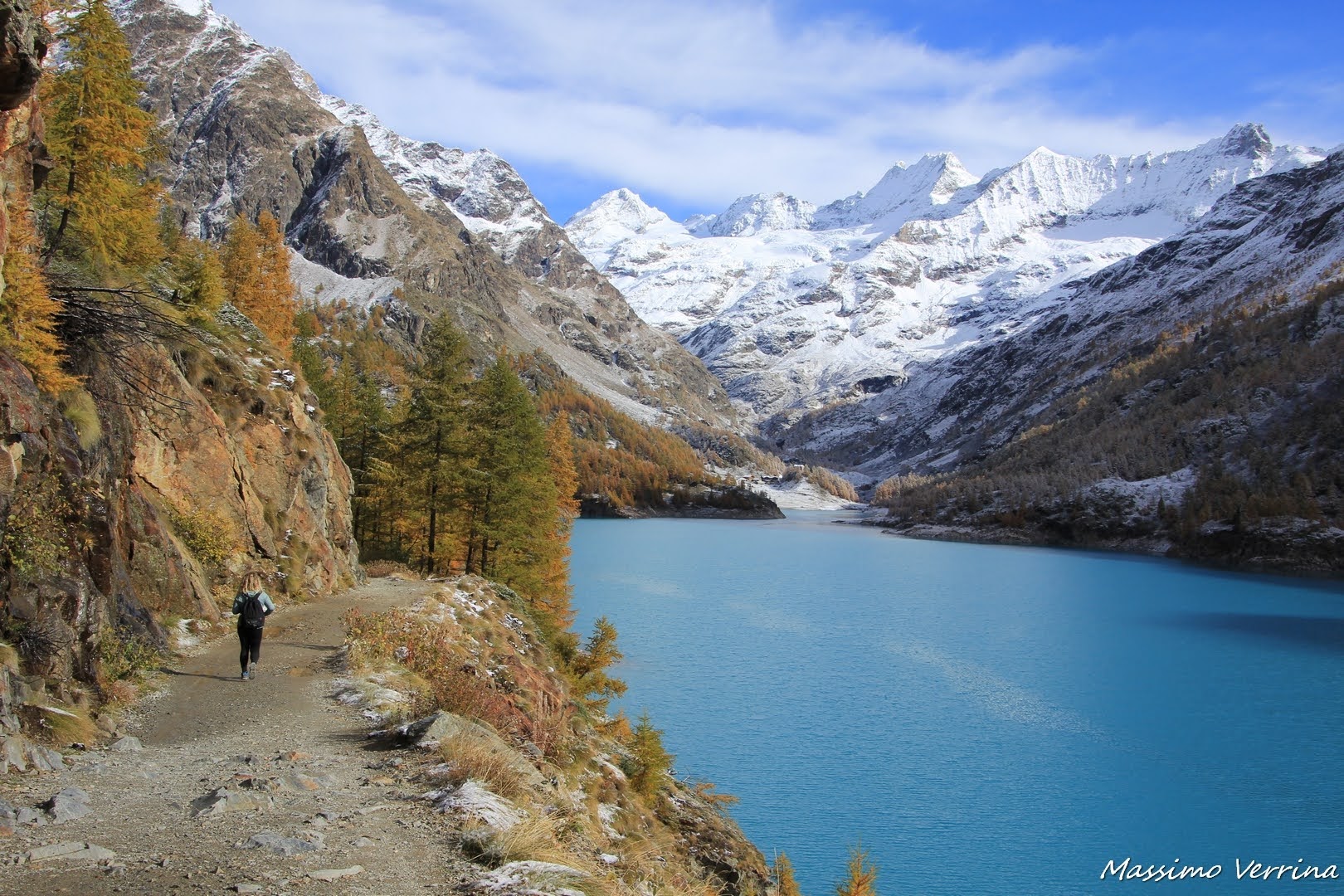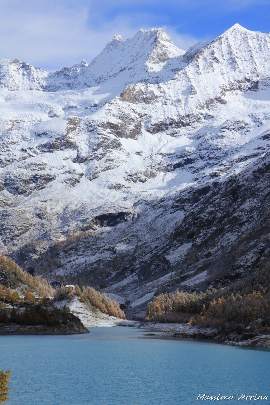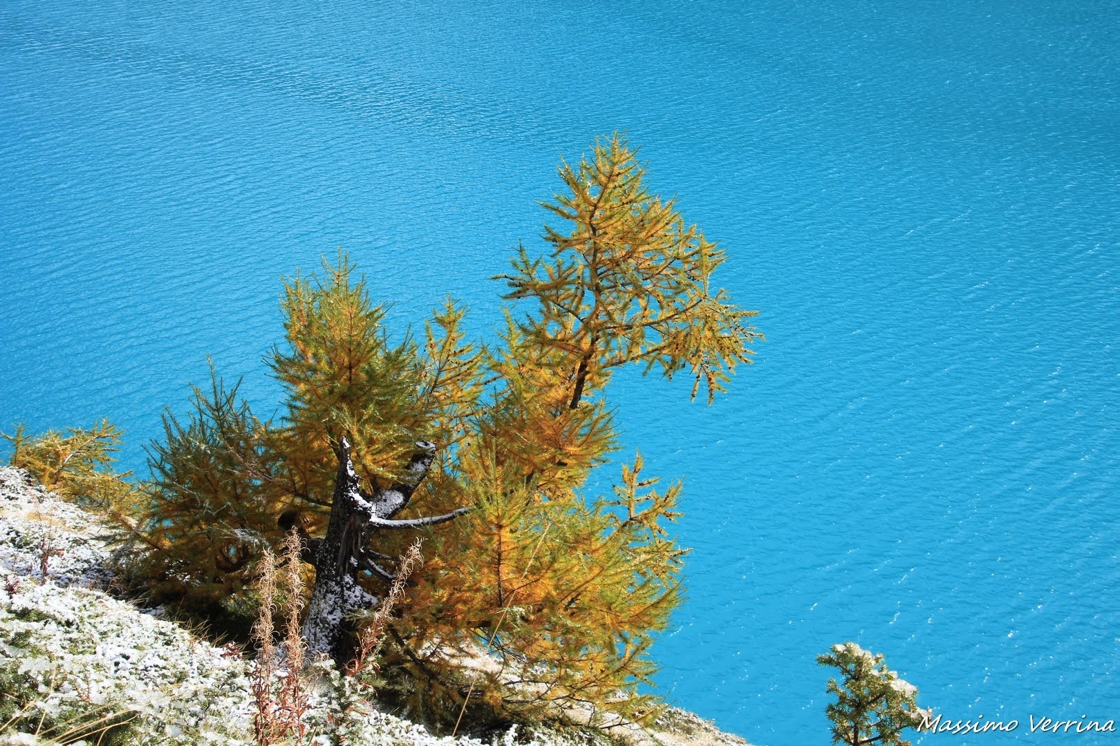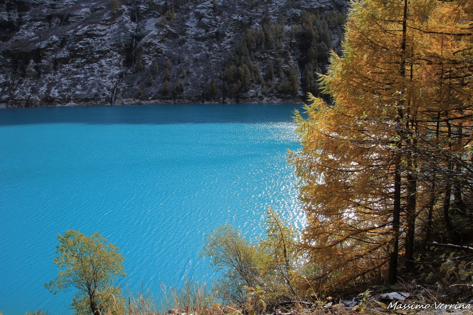 Il turchese del lago spunta fra i larici coloratissimi, il contrasto è così bello da lasciarmi senza parole, mi fermo ad ascoltare il mormorare del vento, mentre frammenti di neve cadono sul mio corpo dall’alto dei rami….