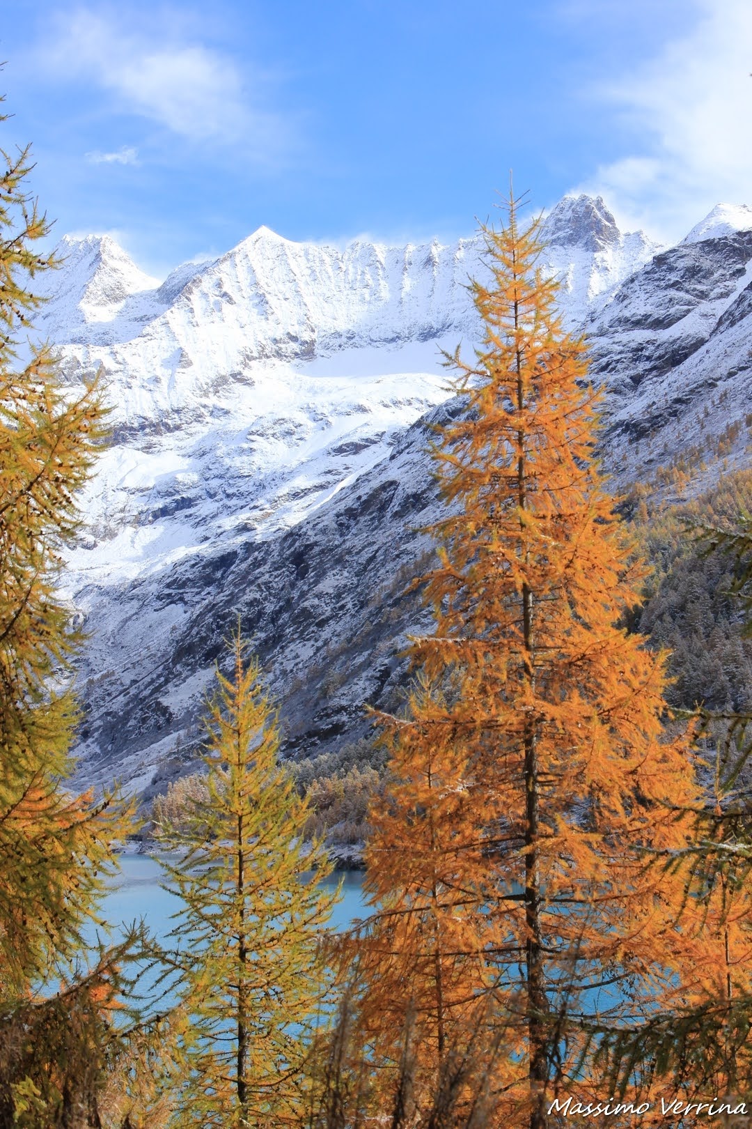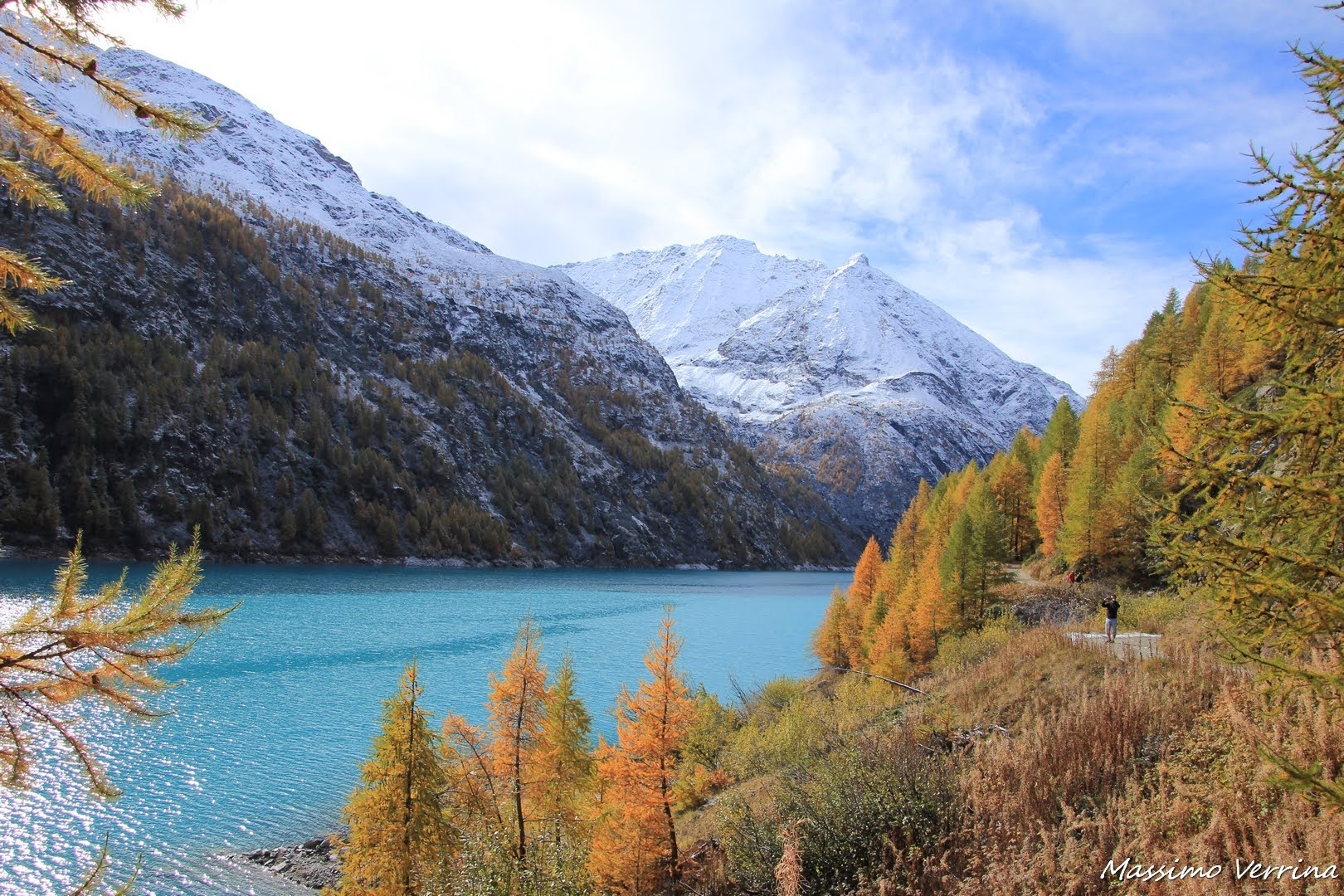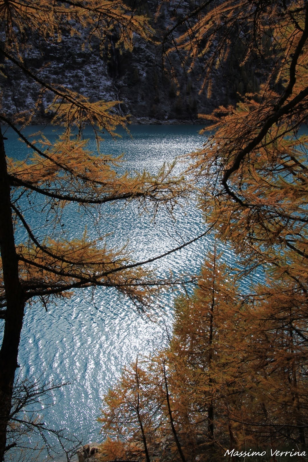 Alcuni larici aveva una doppia cromia di colore, più verdi su un lato, più rossicci sull’altro, l’incanto delle acque del lago illuminate dal sole creavano un tappeto di colore dove ogni parola era vana…