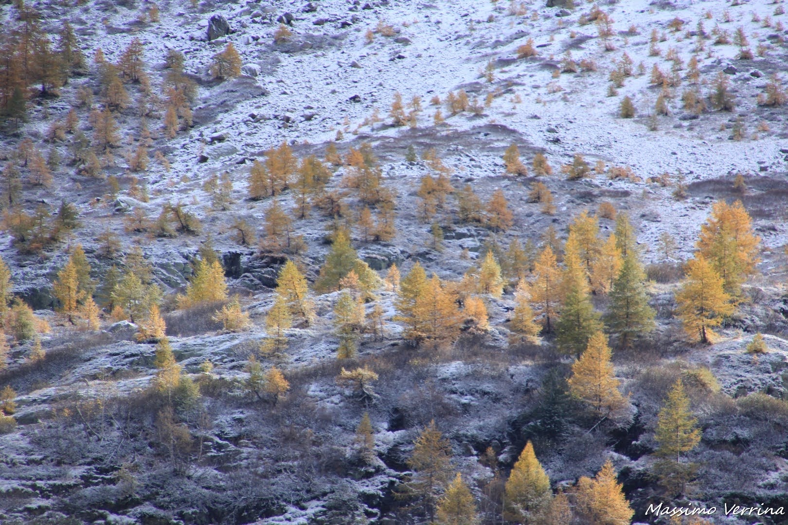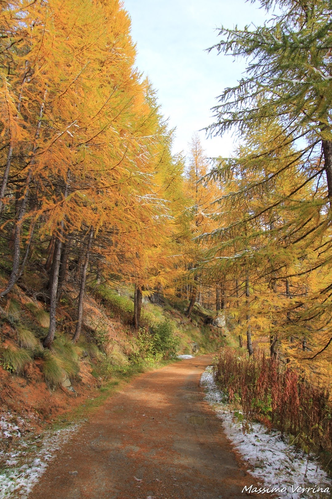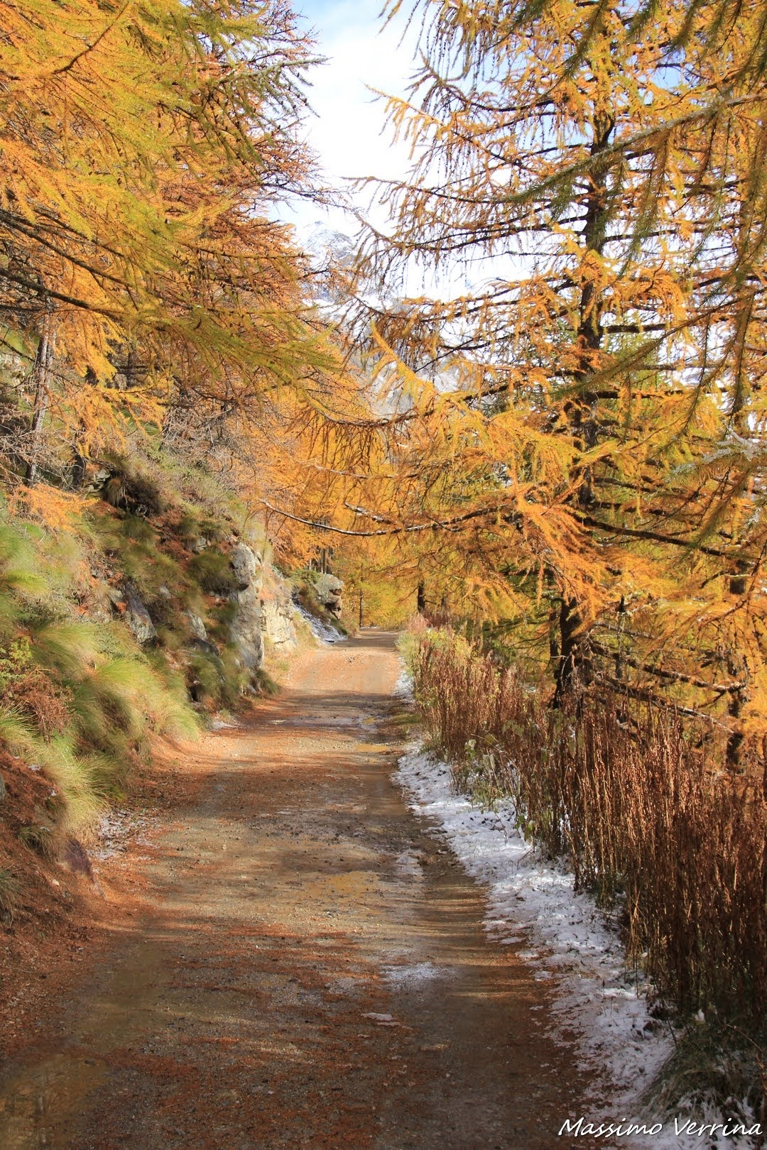 Il sentiero davanti a mi avvolgeva nel caldo dei suoi colori accesi, sentivo il profumo dei larici, della terra bagnata, del sottobosco. La neve in alcuni tratti si stava già sciogliendo, in fondo eravamo solo a fine ottobre, e nelle basse pianure ancora si respirava un caldo fuori stagione…