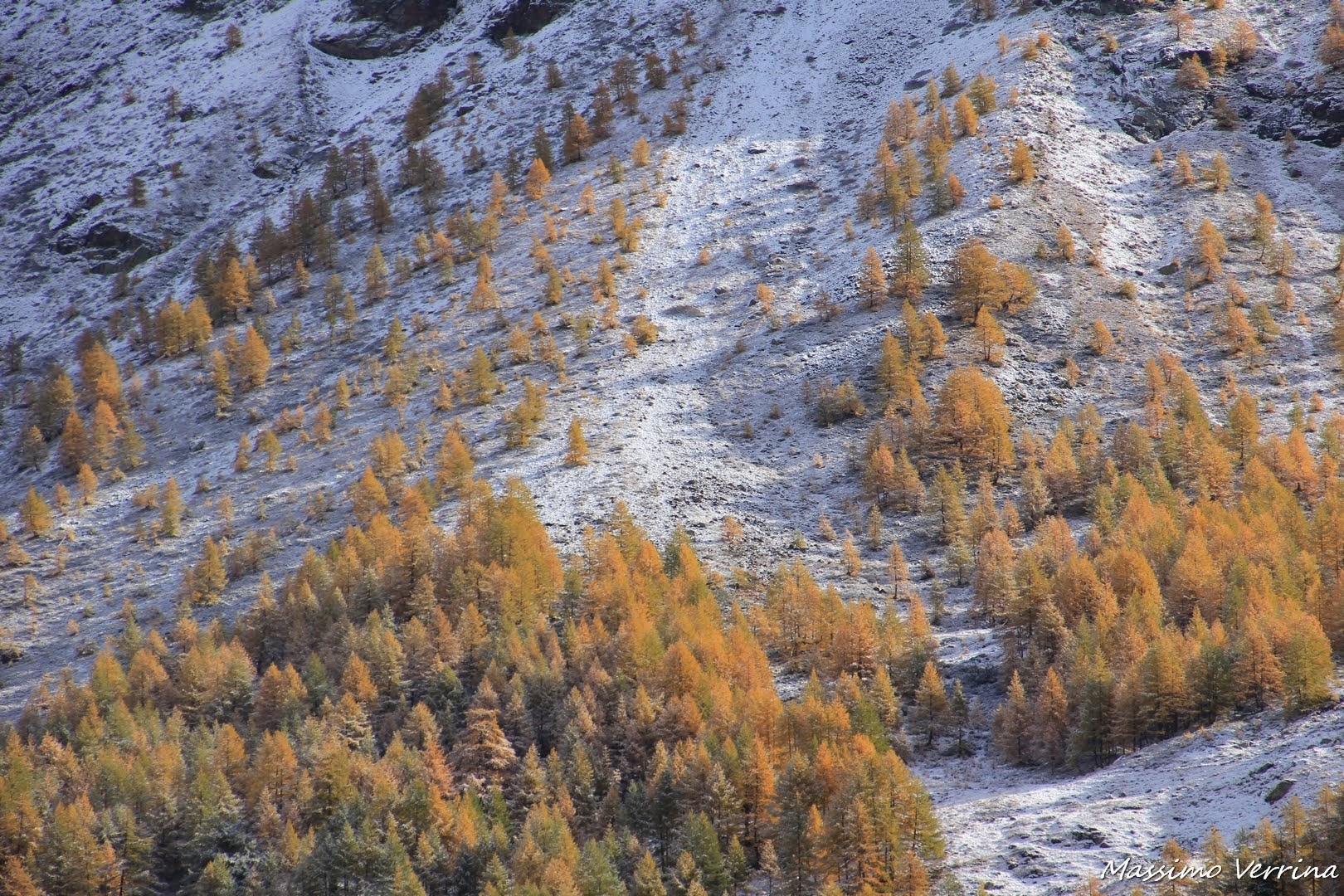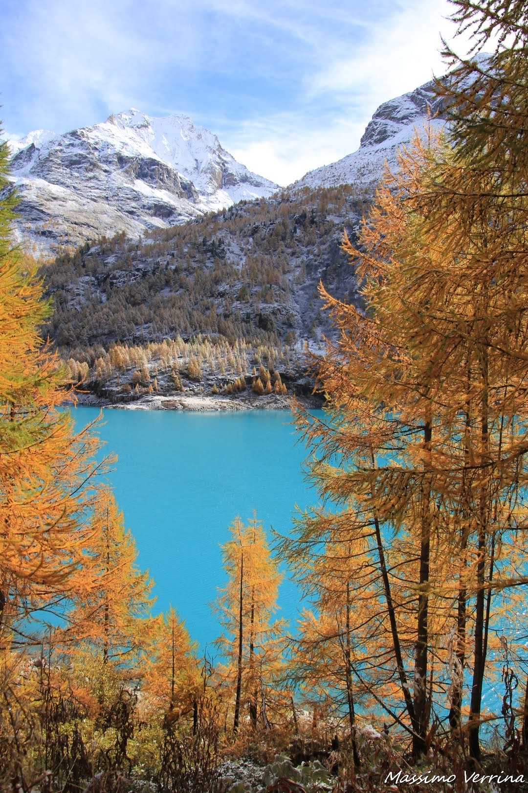 Mi volto indietro, l’inizio del sentiero da lì non si vedeva più, si scorgeva la maestosa vallata che sembrava cullare quello specchio turchese, adornato da una parte dai colori dell’autunno, dall’altra da quelli dell’inverno. Due stagioni presenti nella stessa scena, non capita sempre di trovare scenari simili….