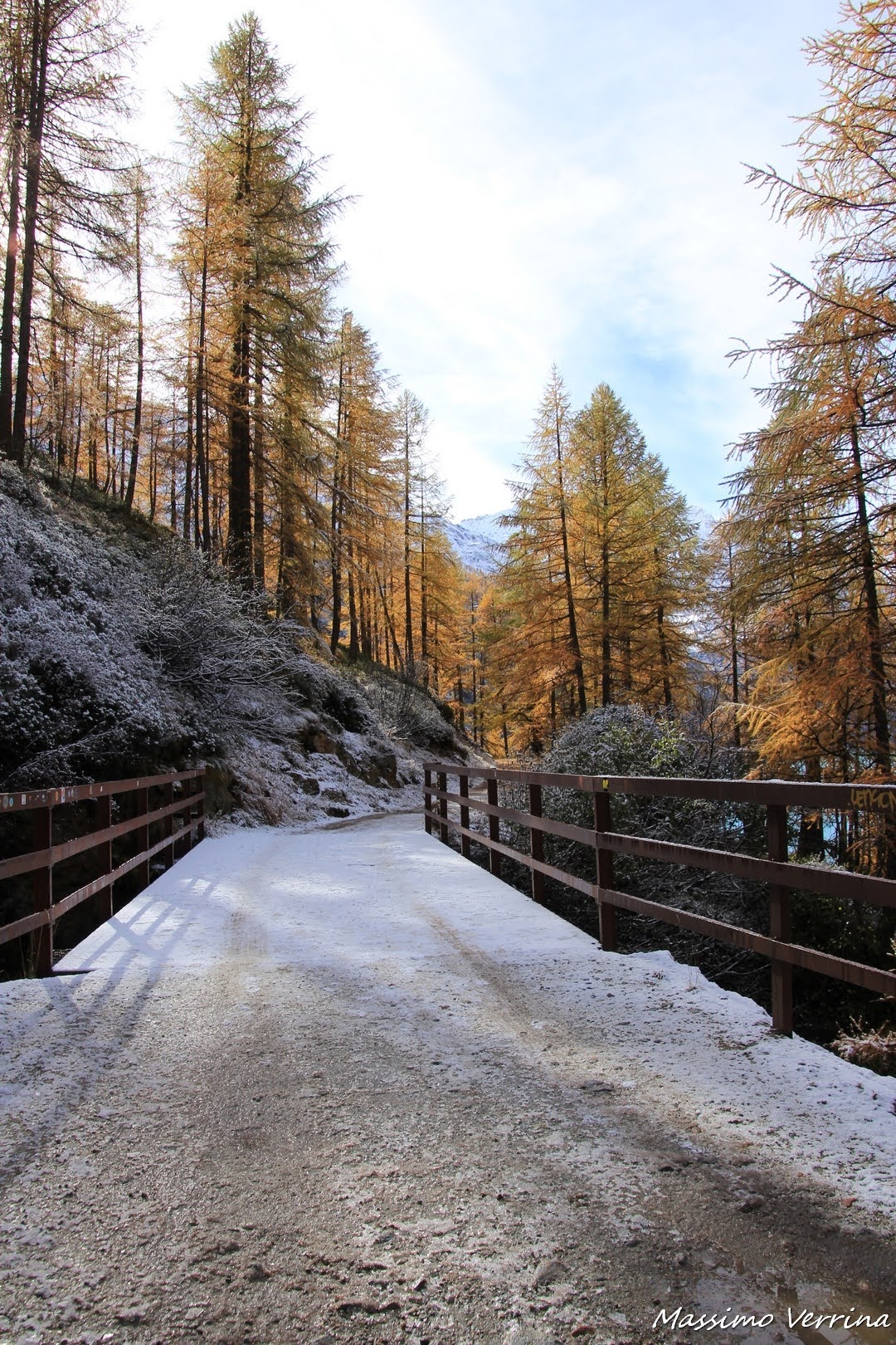 Che dire poi della luce radente che ho scelto per il prossimo scatto. I raggi del sole illuminavano un larice con la neve in cima che sembrava giusto un albero di Natale, mancava solo la stella in cima, per non parlare del bellissimo ponticello che andremo ad attraversare…