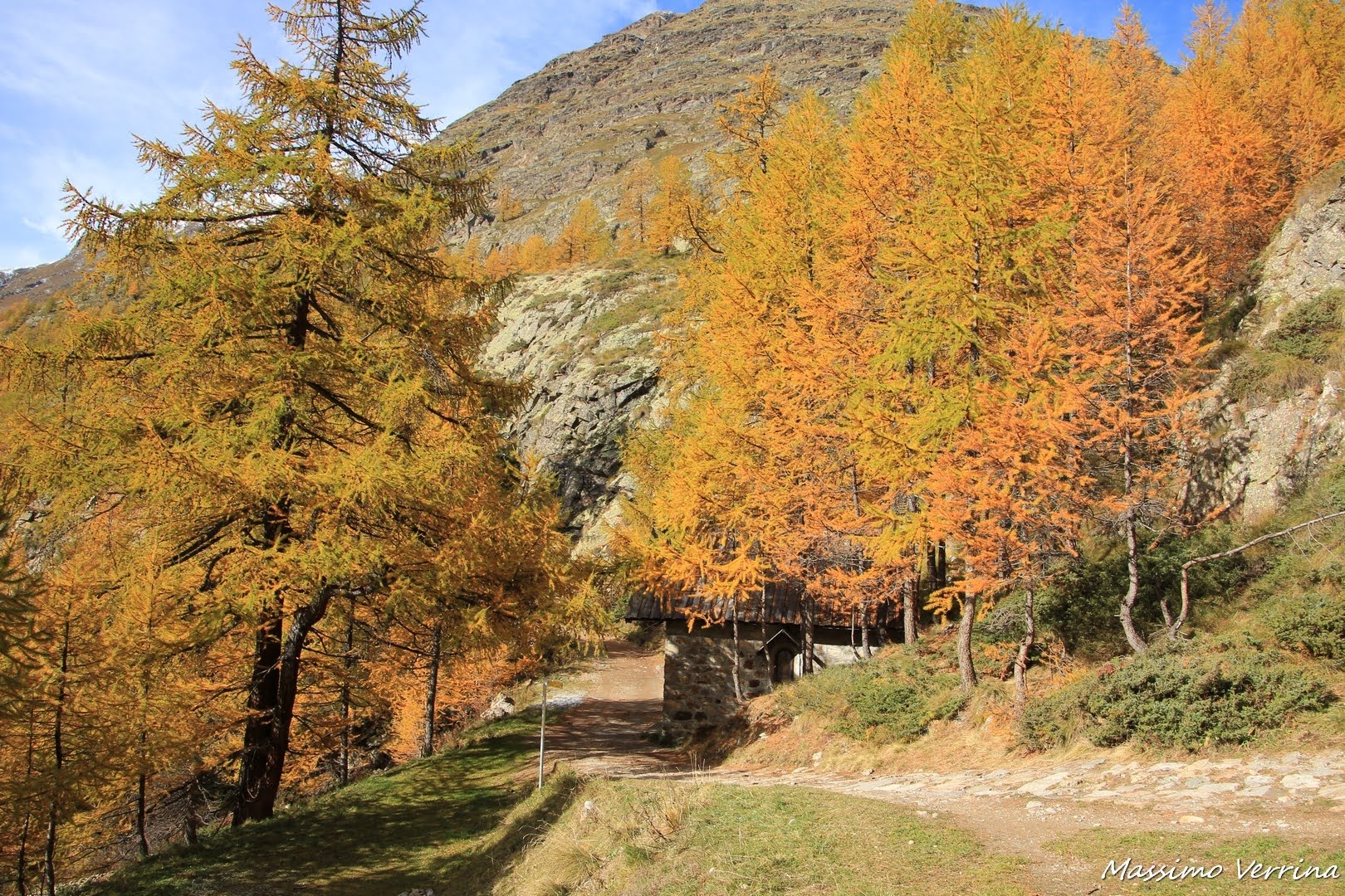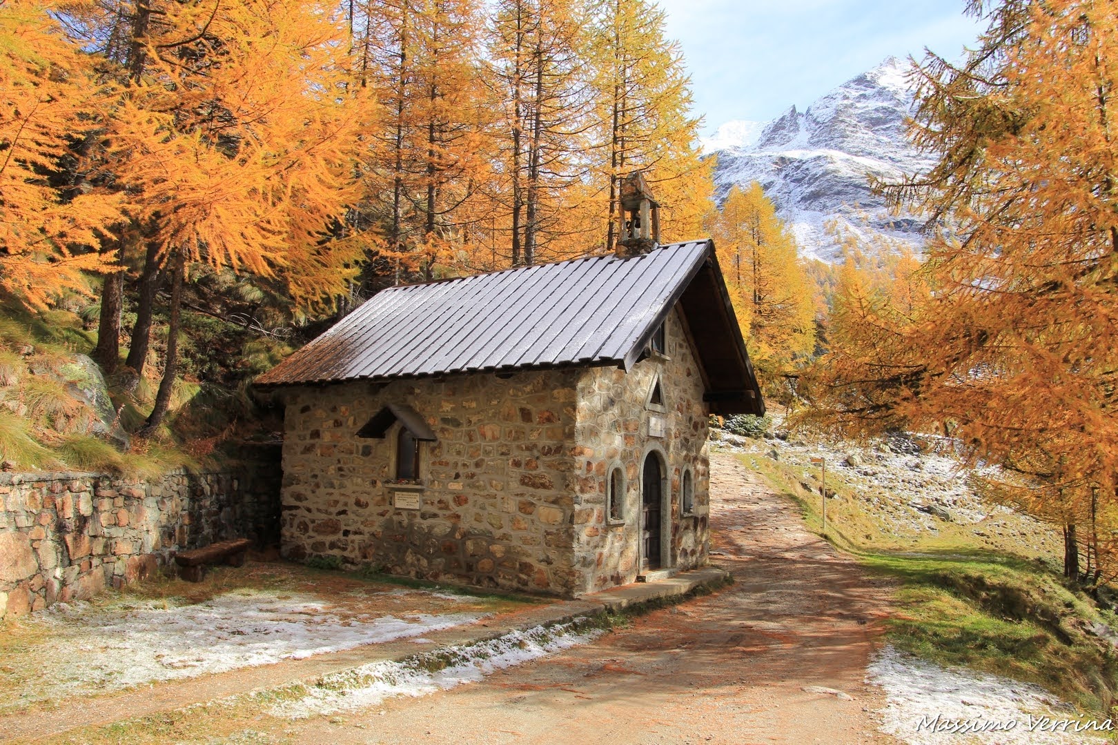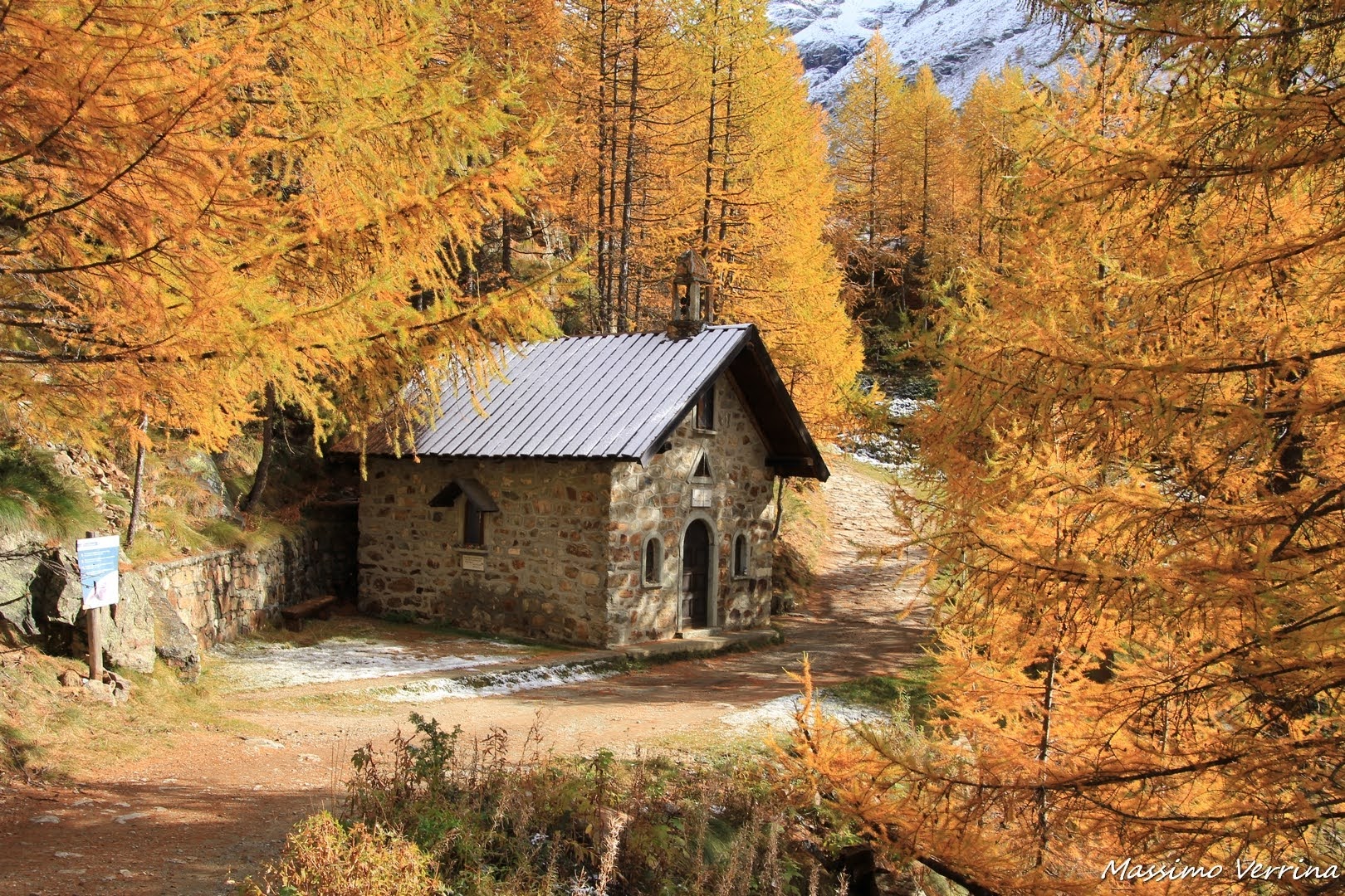 Questo percorso di trekking era ancora in grado di stupirmi, dopo aver ammirato cascate, ponti, larici, neve, era la volta di una piccola chiesetta. Spuntò alla mia vista dopo una curva del sentiero, e come per magia, fra il colore intenso dei larici ecco questa minuscola chiesetta…