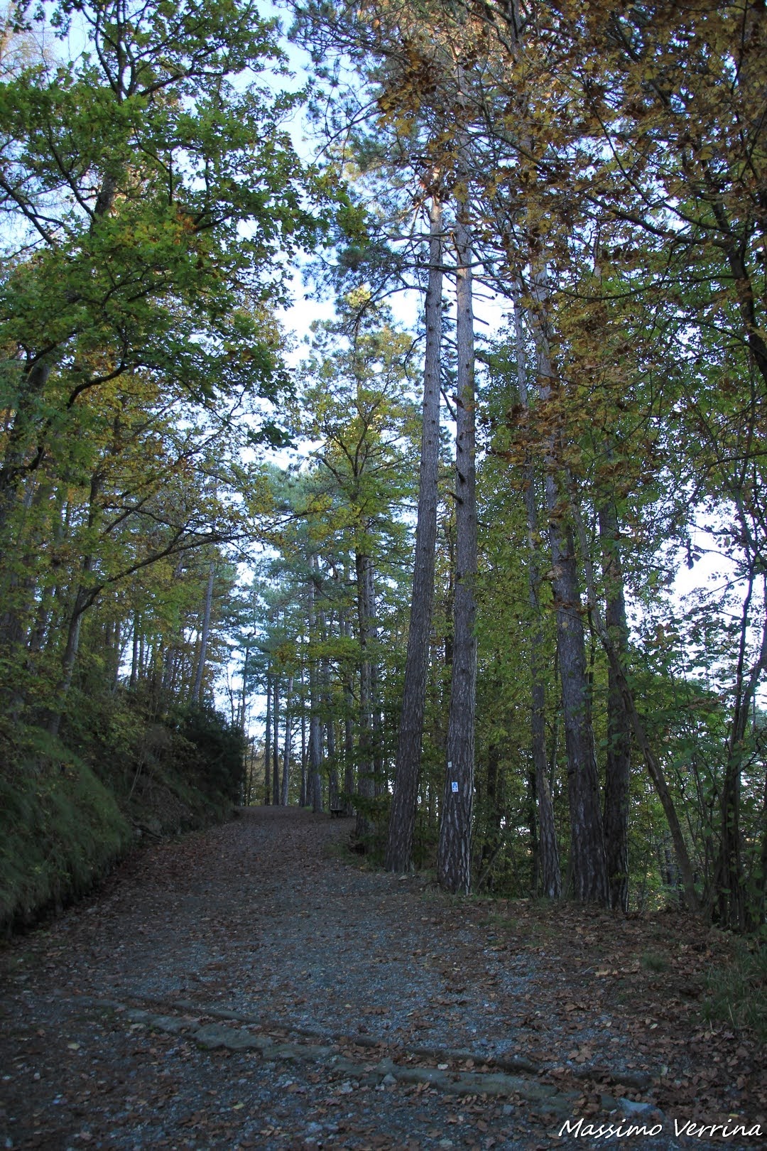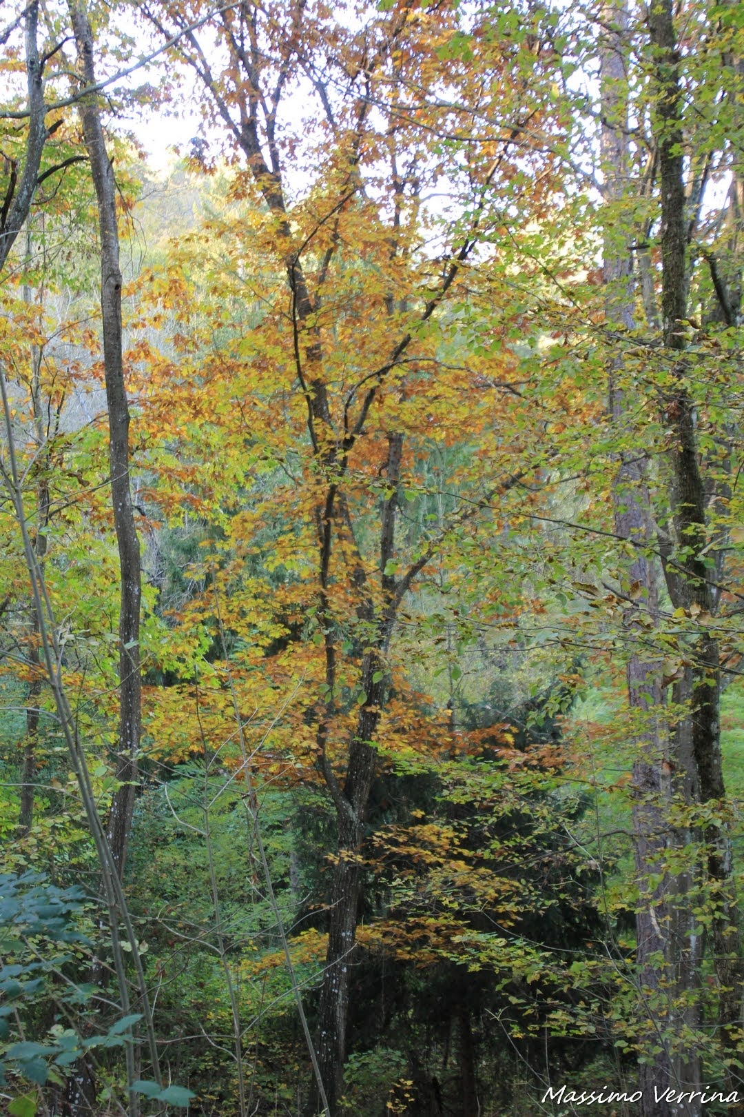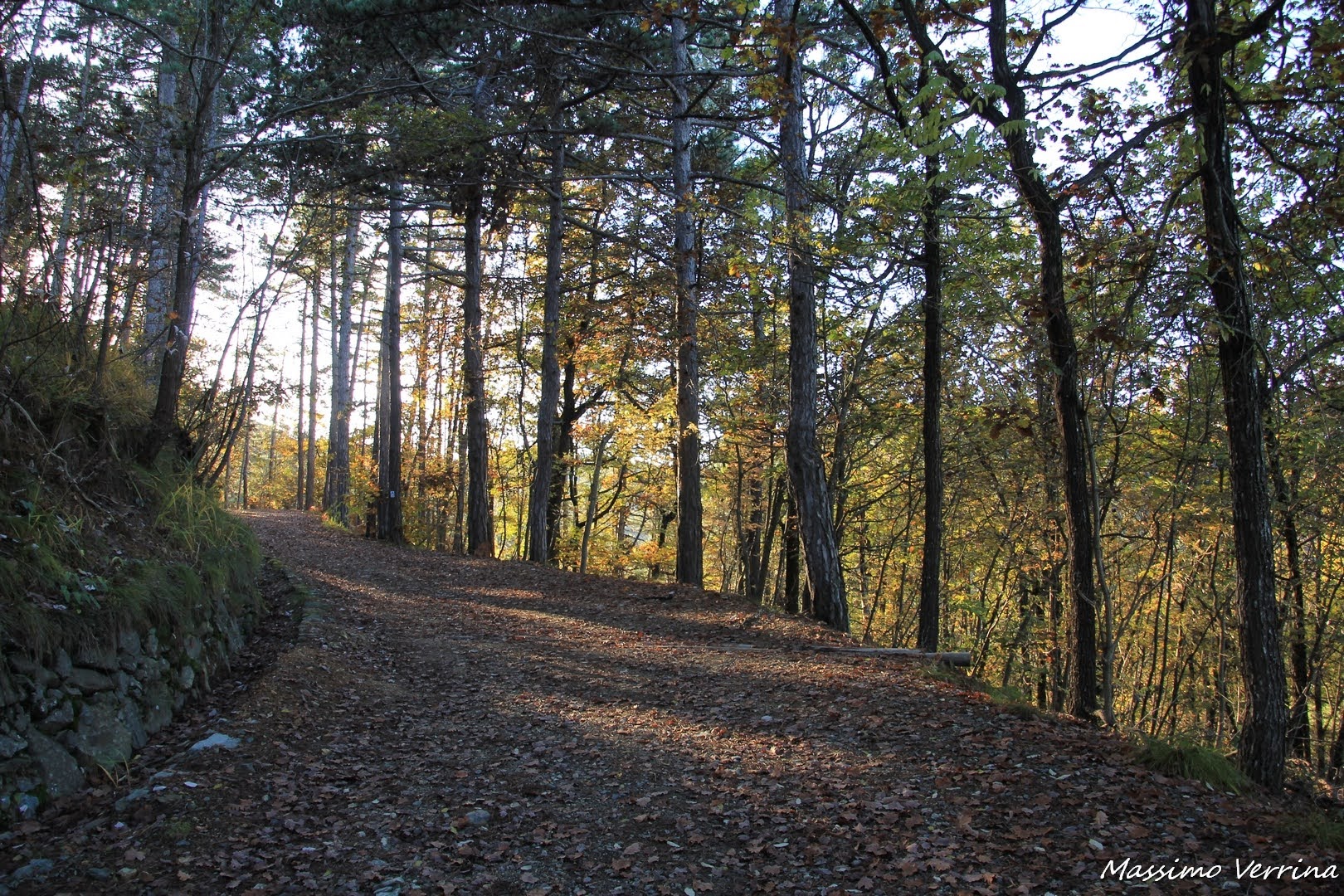 Mentre tutta la prima parte del percorso era già in ombra, salendo ecco i raggi del sole che spuntavano da dietro il colle per lasciare il loro ultimo caldo abbraccio, andando ad illuminare la bella colorazione del bosco, che sembrava accendersi davanti ai miei occhi…