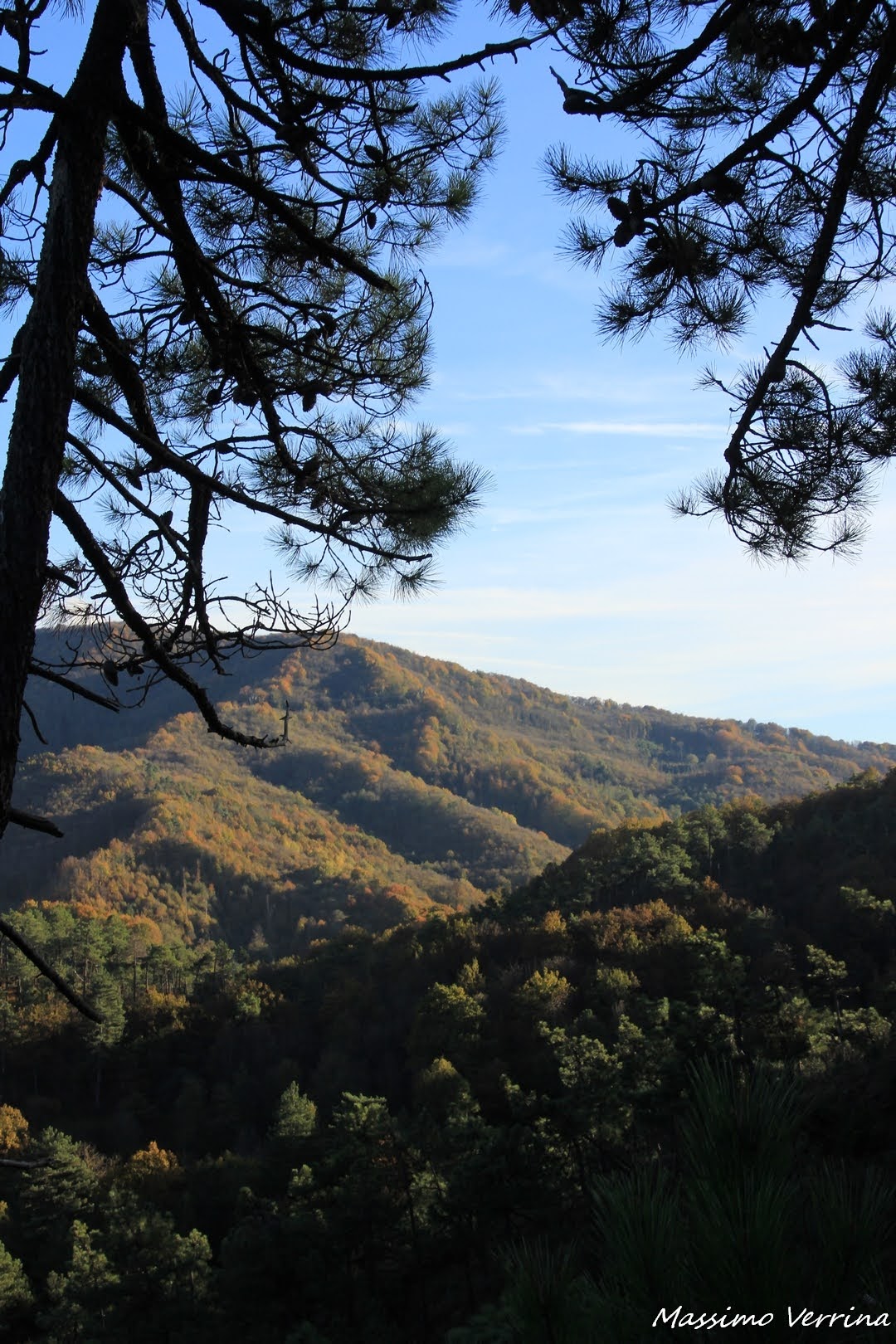 Delle piccole nubi in cielo creavano un’atmosfera poetica che ben si accompagnava alle immagini che volevo catturare. Vi parlavo all’inizio della diversità della vegetazione e del clima che si può incontrare in questa vasta foresta, su questo versante come potete notare ci sono pini marittimi e una vegetazione sempre verde, mentre sul versante dove torneremo più avanti il foliage domina la scena…