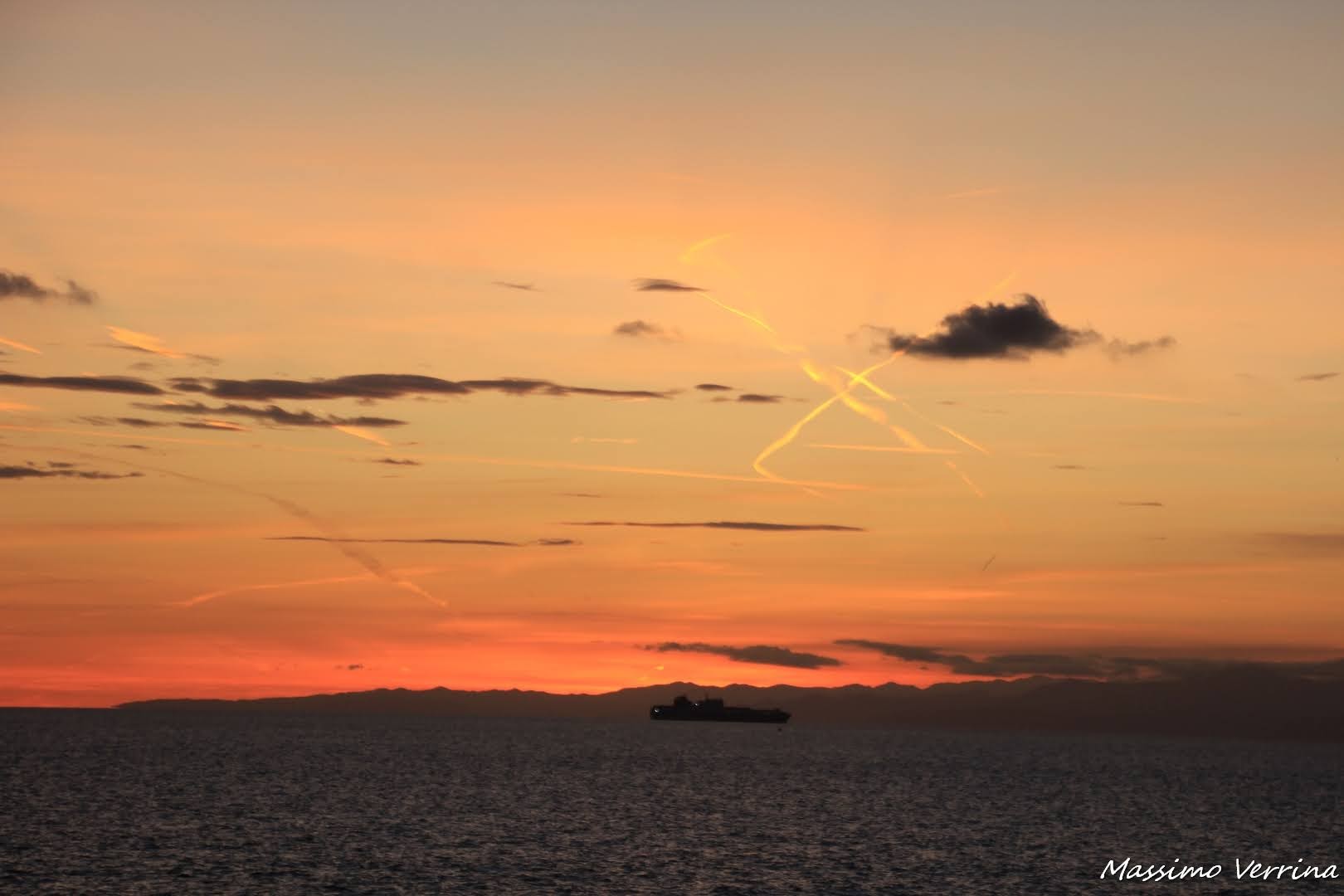 Nel cielo le scie degli aerei dipingono forme astratte sulla tela della notte, mentre le prime luci si accendono lungo la costa, che si prepara alla lunga notte d’inverno…