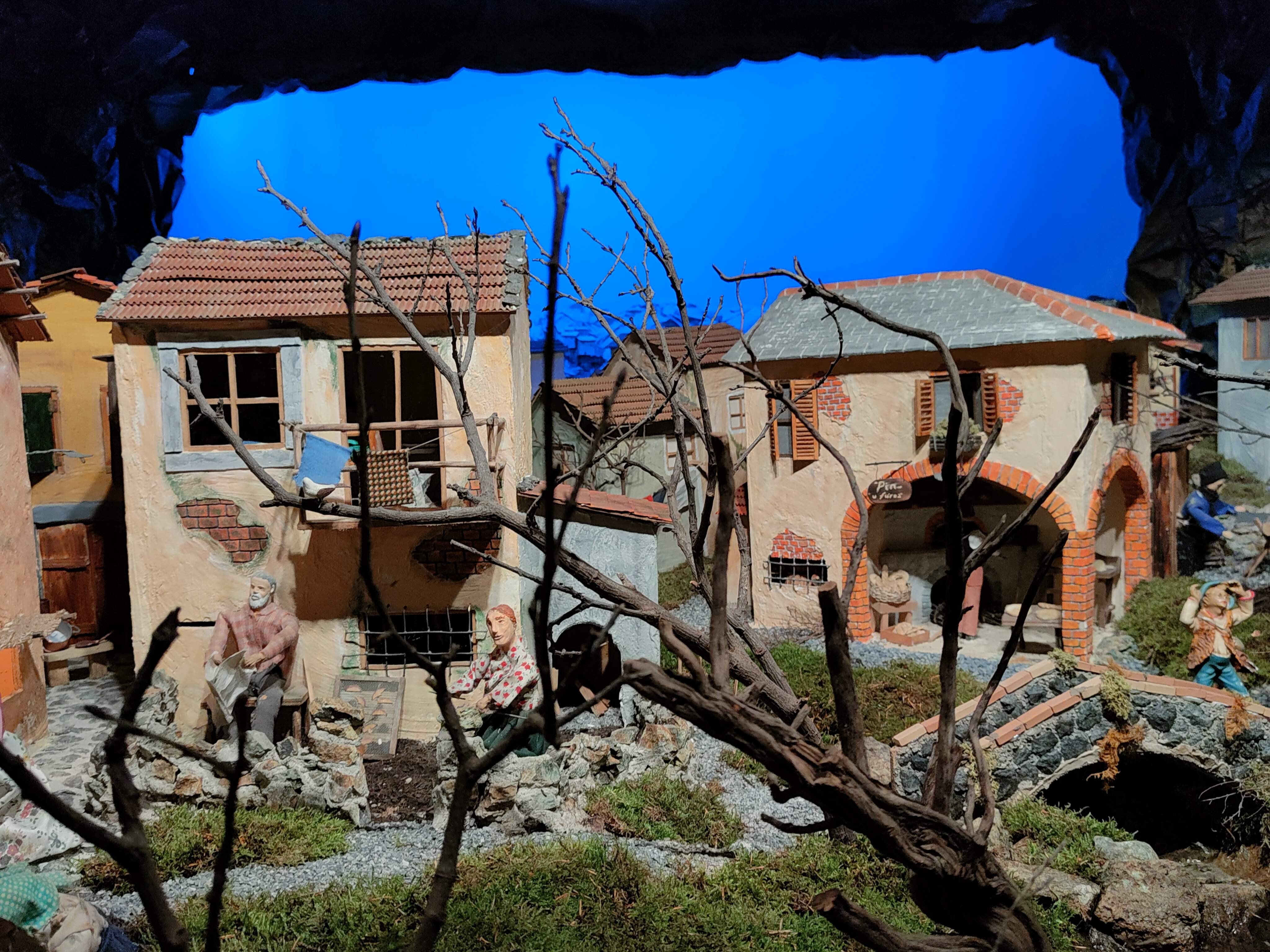 Ecco altri particolari che sono delle vere immagini della vita quotidiana di un tempo, l’uomo che legge il giornale nel cortile davanti a casa, i poggioli in legno, il ponte in pietra, e poi quel cielo blu davvero particolare che è stato ricreato in queste presepe….