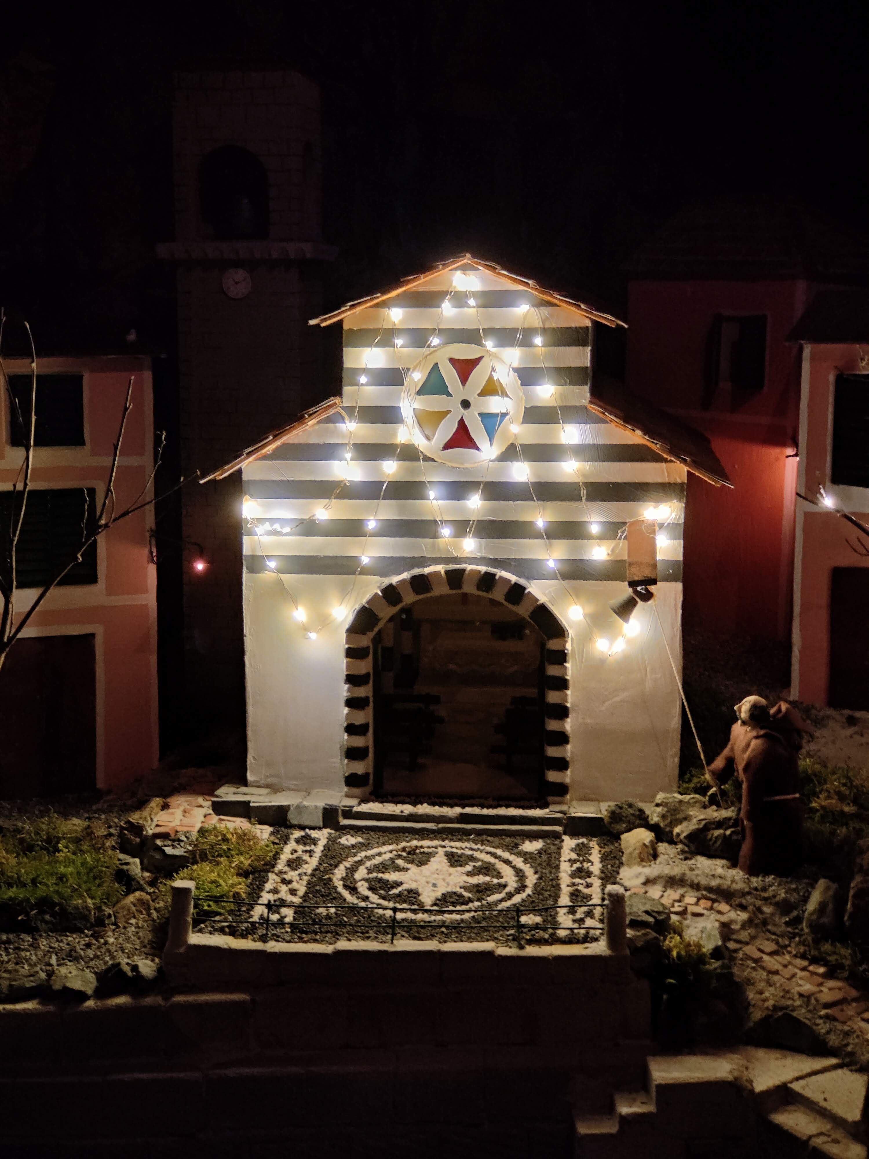 L’arrivo della notte sul borgo marinaro è davvero suggestiva, si apprezzano particolari che con la versione illuminata a giorno non si notavano. Qui vi faccio notare oltre alla facciata della Chiesa illuminata, anche il parroco che suona la campana per attirare i fedeli…