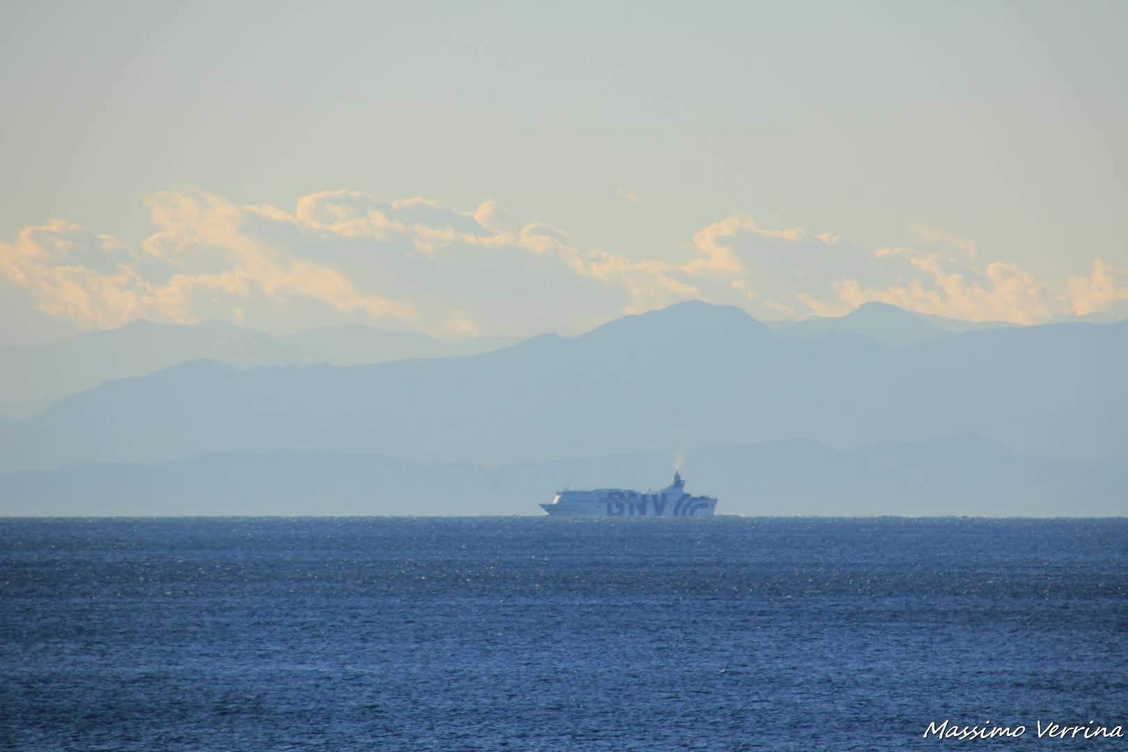 Mentre a Camogli c’era quasi calma di vento, sul ponente ligure forti raffiche di tramontana spazzavano il mare. Col prossimo scatto ho voluto cogliere sia la nave in viaggio verso le grandi Isole, che l’atmosfera tempestosa del mare, uno scatto che visto in un contesto isolato può ricordare i mari del nord, data la presenza delle montagne sullo sfondo…