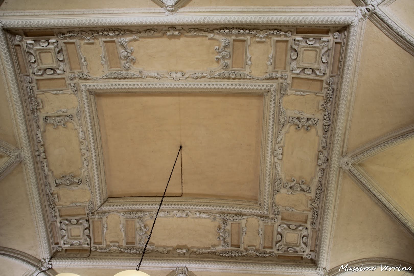 Appena entrati dalla parte nord del Palazzo siamo accolti da quello che a tutti gli effetti ci appare come un salone di un grande Hotel, il piano terra è infatti adibito ad uffici ed è stato in parte riordinato proprio per accogliere questi spazi lavorativi. Questa parte del Palazzo per questo motivo non è visitabile. Diamo un’occhiata al soffitto, qui possiamo notare i primi stucchi decorativi che incorniciano il lampadario principale….