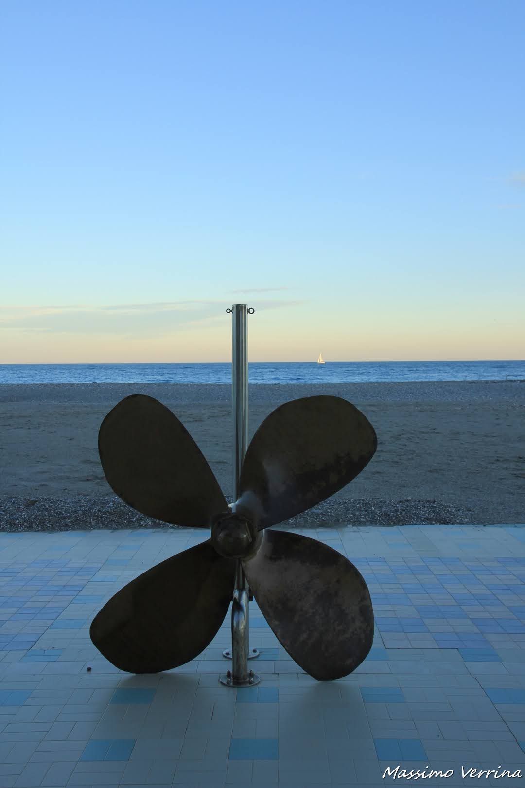 Poco distante ecco un’elica, altro simbolo per eccellenza della marineria. Quel giorno c’era poca gente in giro, tutto appariva fermo, vivevo in un tempo sospeso, passeggiando lungo il litorale, mentre a grandi passi il tramonto mi sfuggiva di mano…