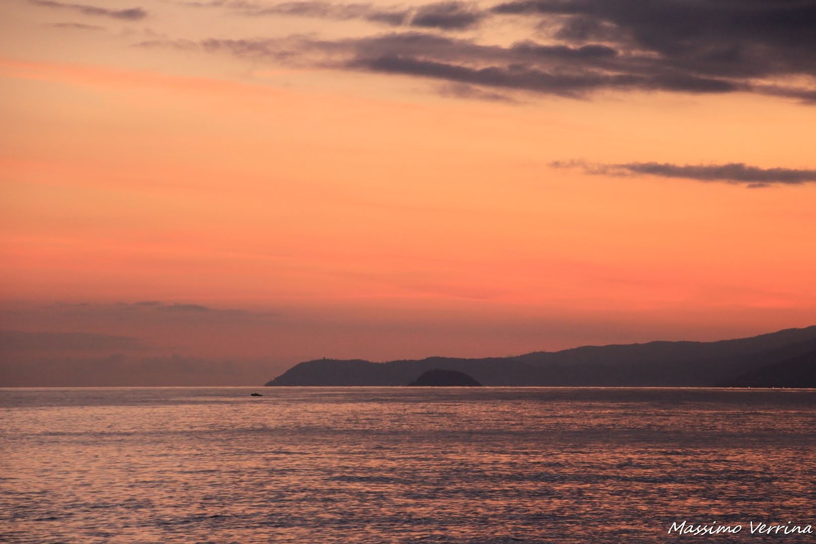 In lontananza il piccolo isolotto davanti ad Albenga che avete osservato nella narrazione precedente, si staglia come un’ombra nera fra le luci intense degli ultimi atti del tramonto…