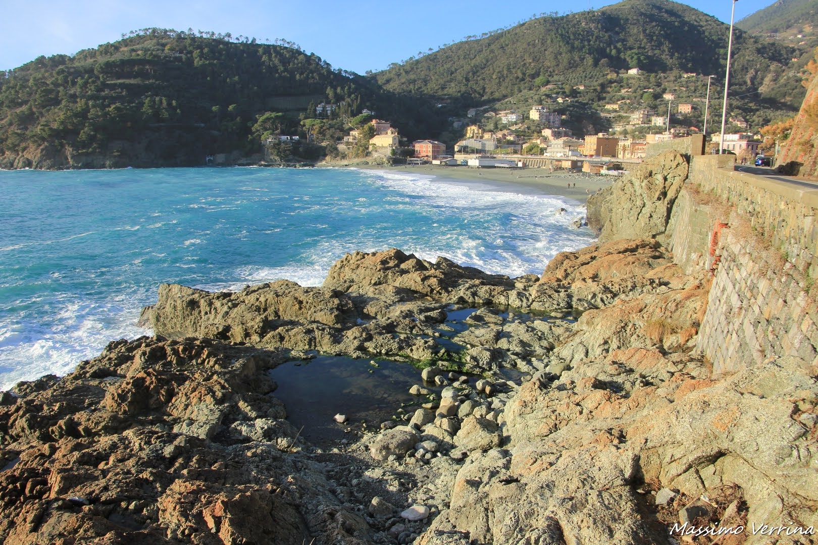 Passo velocemente l’abitato di Bonassola, scendendo per le sue caratteristiche contrade, tipiche della Liguria, qui l’ombra arriva prima per via dei monti che la circondano, il tramonto si stava avvicinando e dovevo andare di corsa per coglierlo a Levanto, meta finale del mio lungo cammino di quel giorno. Intanto nel mio veloce percorso di ritorno colgo ancora qualche aspetto della costa, come i piccoli laghi sulla scogliera dovuti alla mareggiata, con lo sfondo di Bonassola…