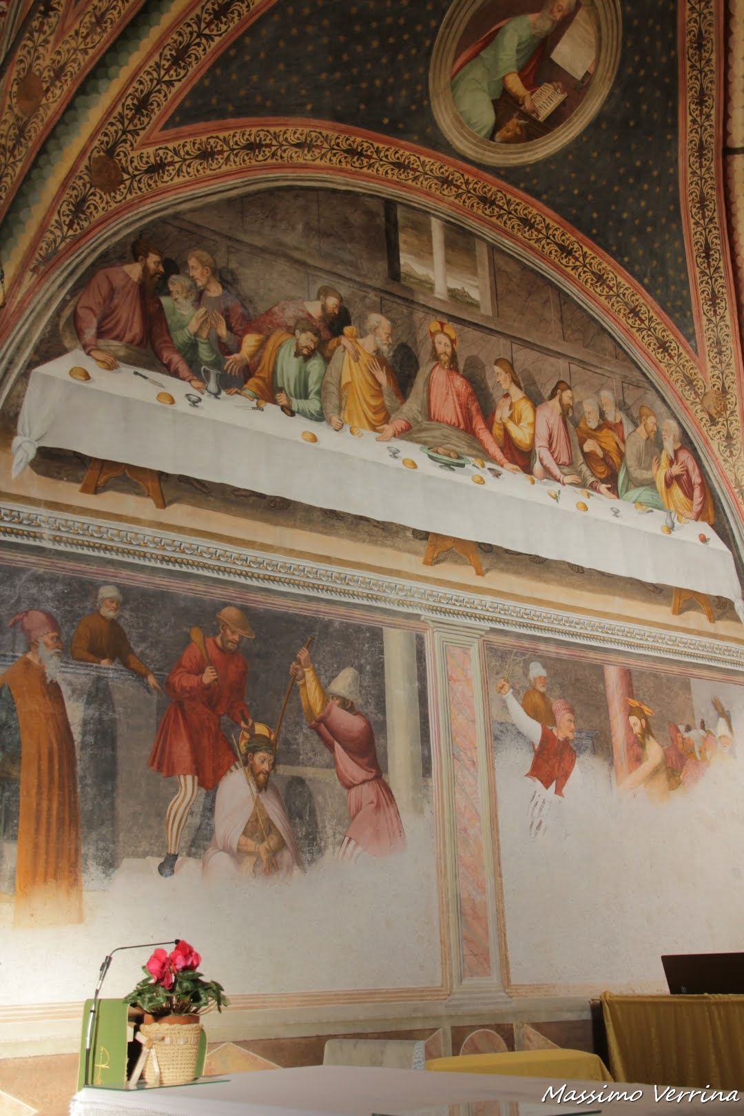 Quelli in alto sono conservati in maniera perfetta rispetto a quelli bassi, non saprei a cosa è dovuto, guardate lo spettacolare affresco dell’ultima cena presente sulla parete sopra all’altare…