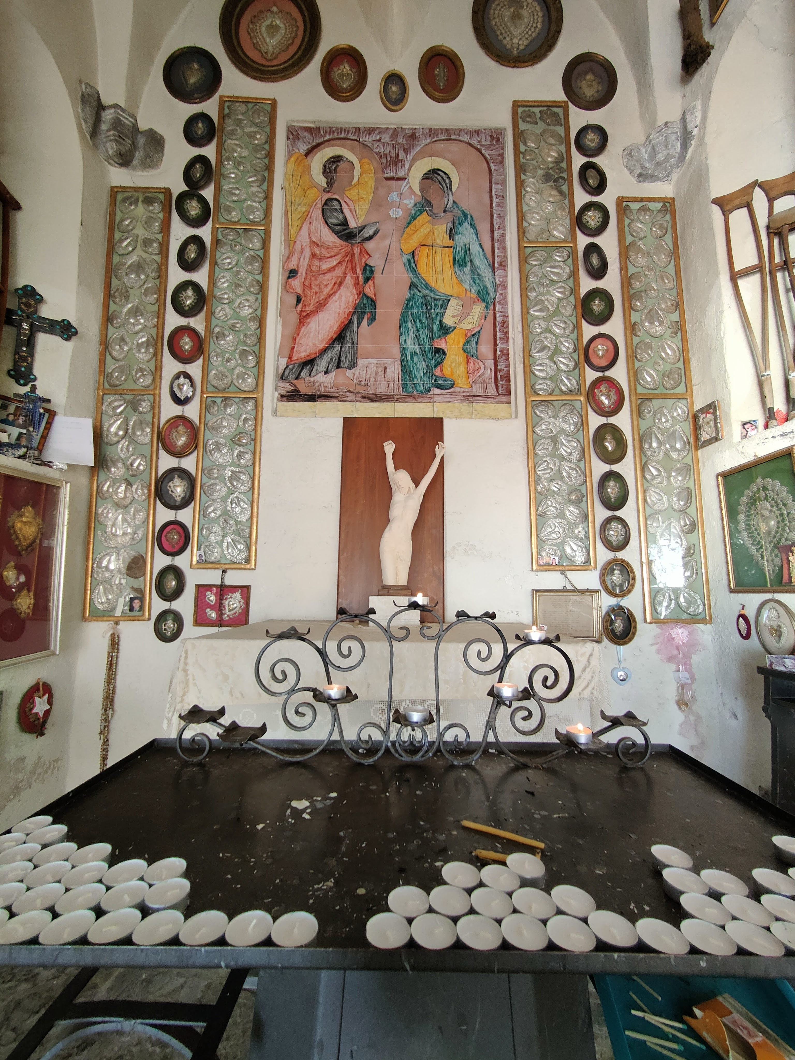 Una volta entrati in questo minuscolo spazio si è completamente avvolti dalla fede, sulle pareti ci sono lavori di ogni genere, ex voto lasciati dagli antichi marinai come riconoscimento alla Madonna. Ce ne sono a centinaia…