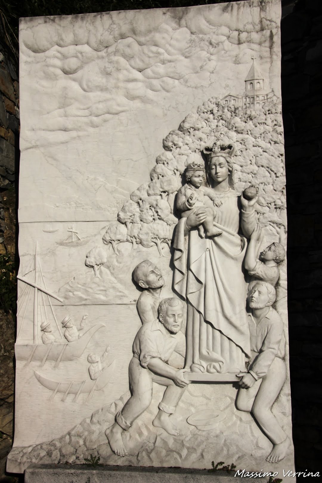 Sul lato ovest della Chiesa, dall’altro ingresso, c’è una bellissima scultura dedicata a questa Chiesa, degli uomini che sostengono la Madonna, un vero simbolo di devozione che non conosce l’ombra del tempo….