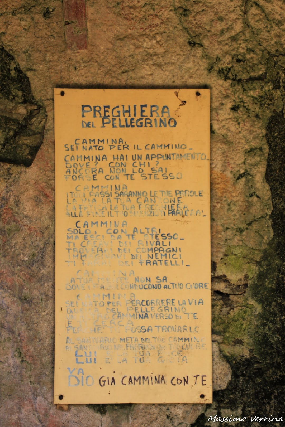 Come tutti i sentieri che conducono a degli edifici religiosi, anche qui durante il cammino troviamo delle piccole stazioni di meditazione, in una di queste ho trovato questo curioso cartello, è una preghiera del pellegrino, è un po’ sbiadita dal tempo, io l’ho trovata molto bella…