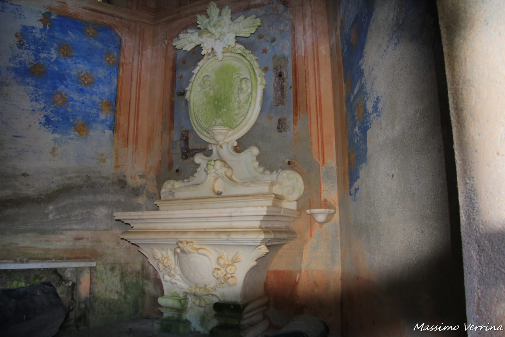 Da un’inferriata esterna faccio entrare l’obiettivo per scrutare un po’ l’interno, non si vede molto, soltanto affreschi rovinati dal tempo e un piccolo altare di marmo…