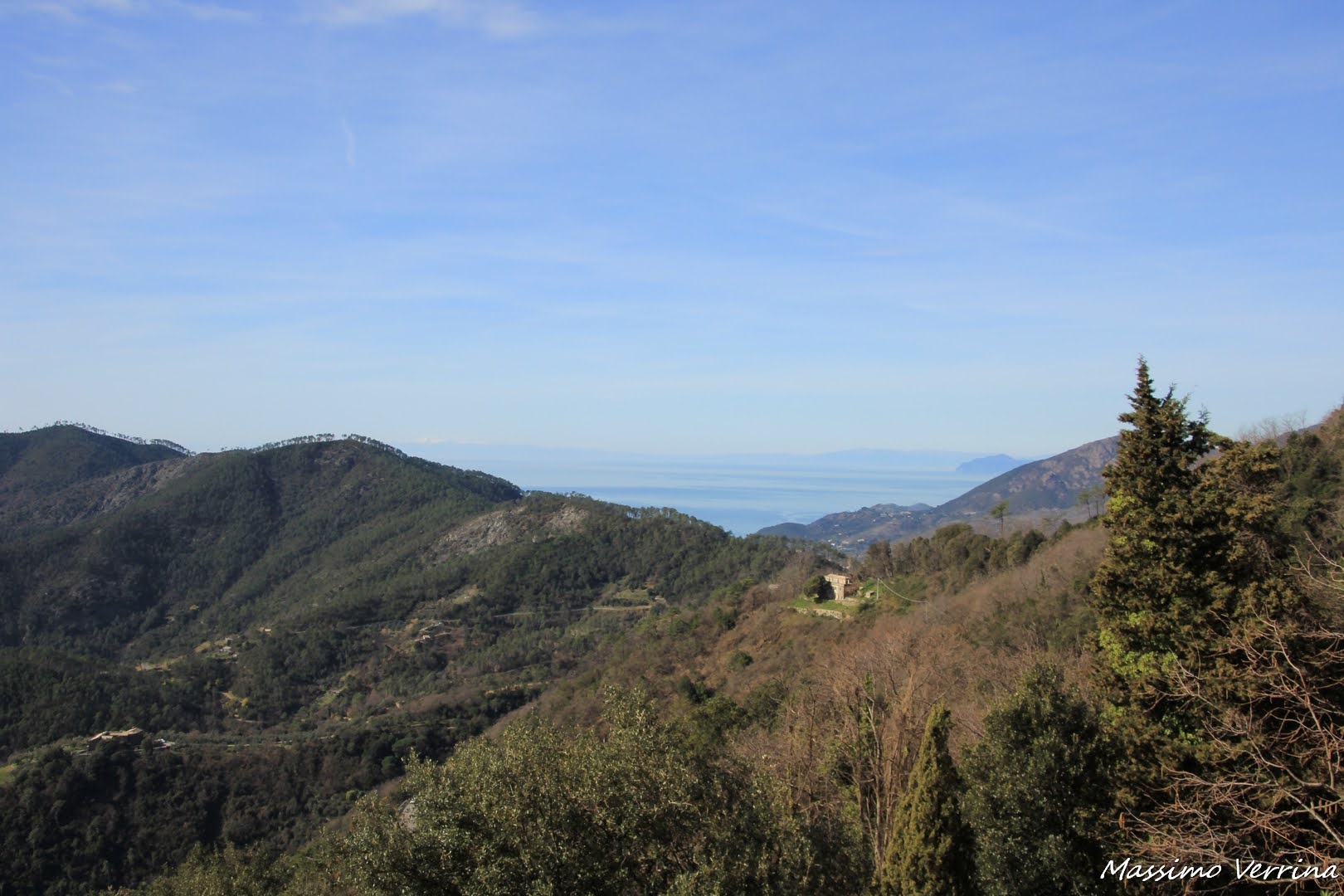 Guardando verso ponente, oltre le colline, spunta la costa ligure nella sua interezza, qui nelle giornate veramente limpide si possono vedere anche le Alpi occidentali. Quel giorno c’era la tipica foschia da caldo, e la visibilità era in parte compromessa, tuttavia la sensazione di meraviglia appare comunque tangibile…