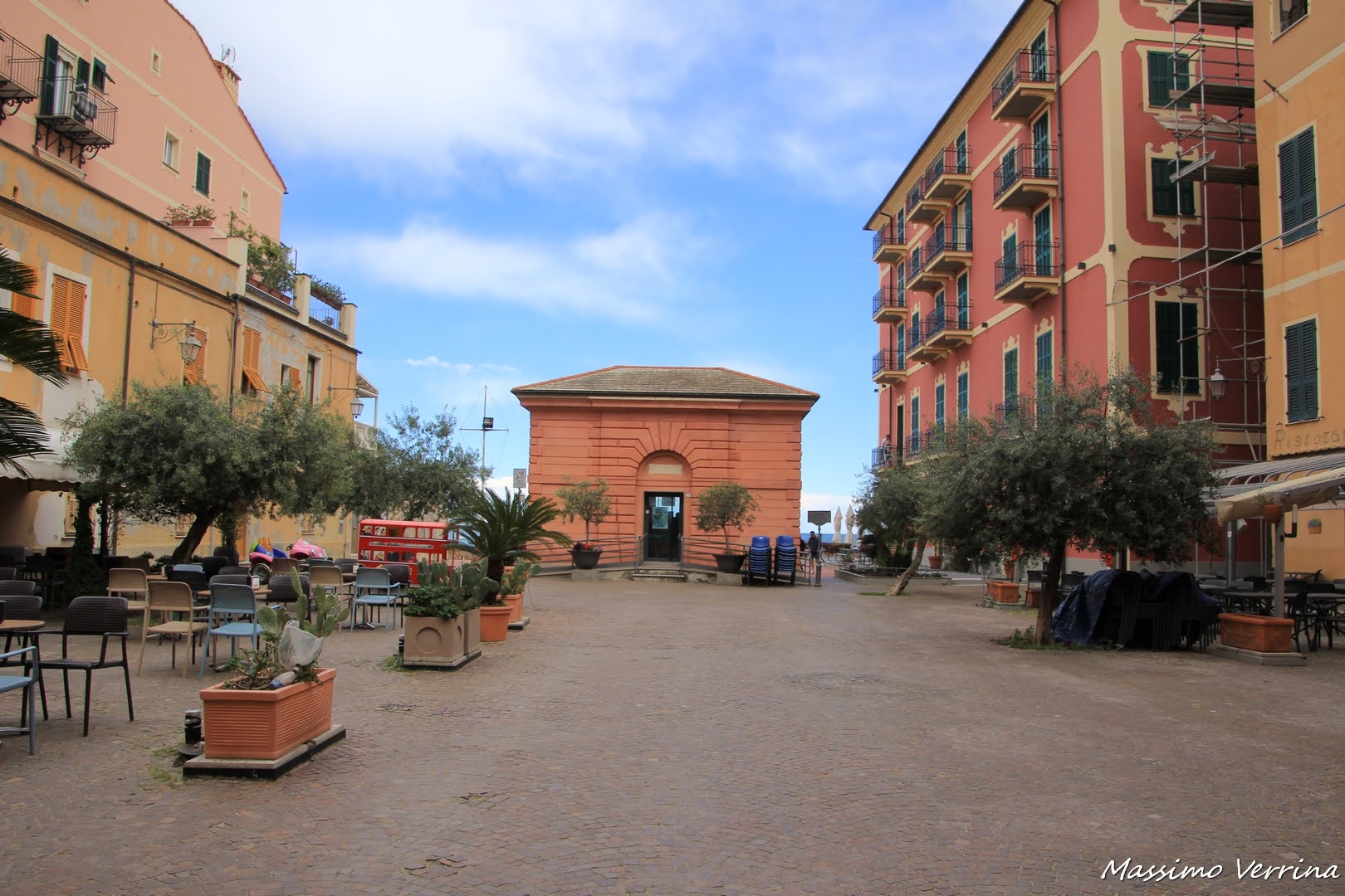 Ci sono anche piazze abbastanza grandi che sfociano sulla passeggiata a mare, dove si trovano diversi locali, e come vedete troviamo delle piante di ulivo anche qui….