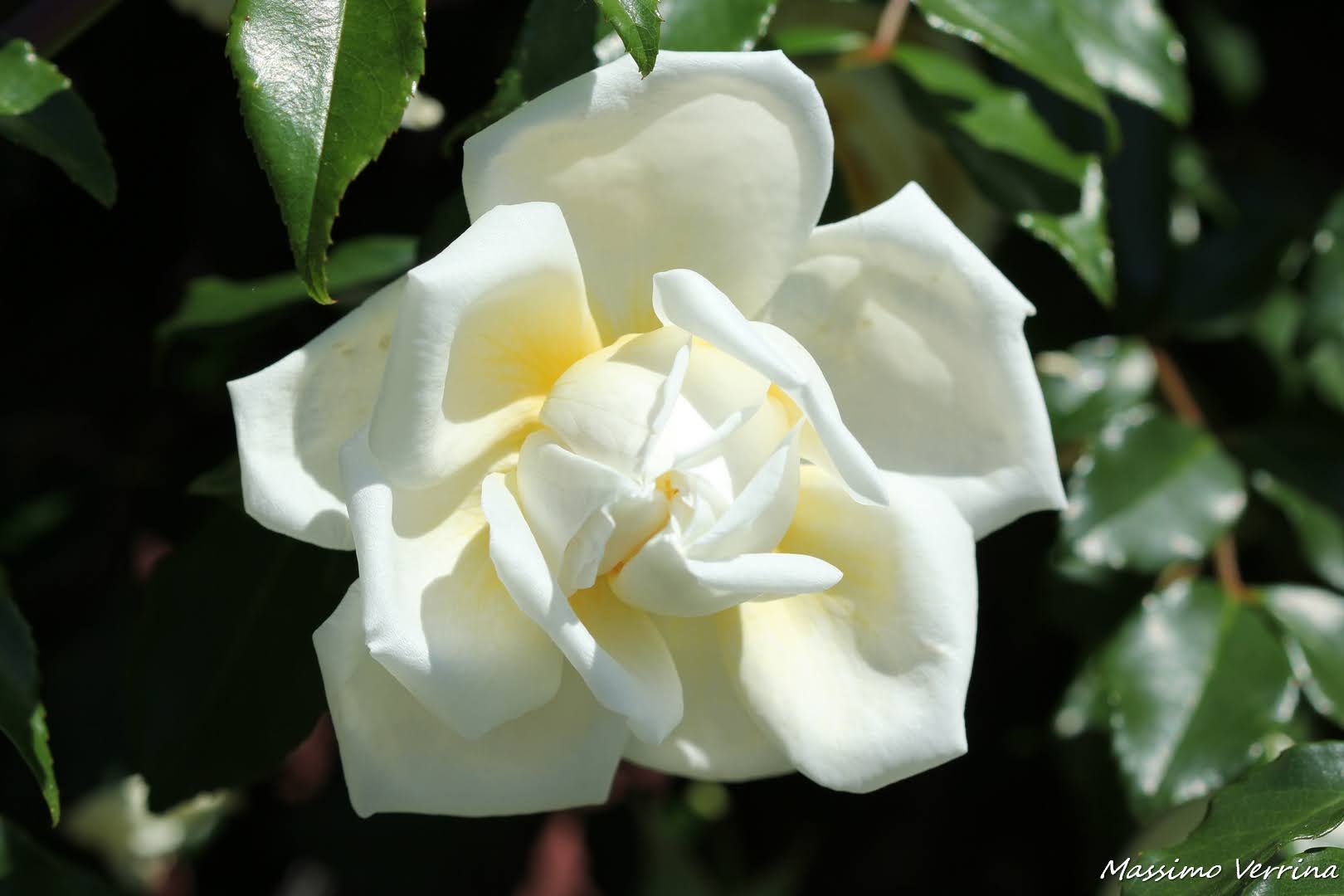Qui anche le rose bianche sembrano contenere il sole, dal loro interno compare una screziata trasparenza di luce che mette in evidenza un timido giallo. L’eleganza in questo caso sposa l’incanto di questa rosa…