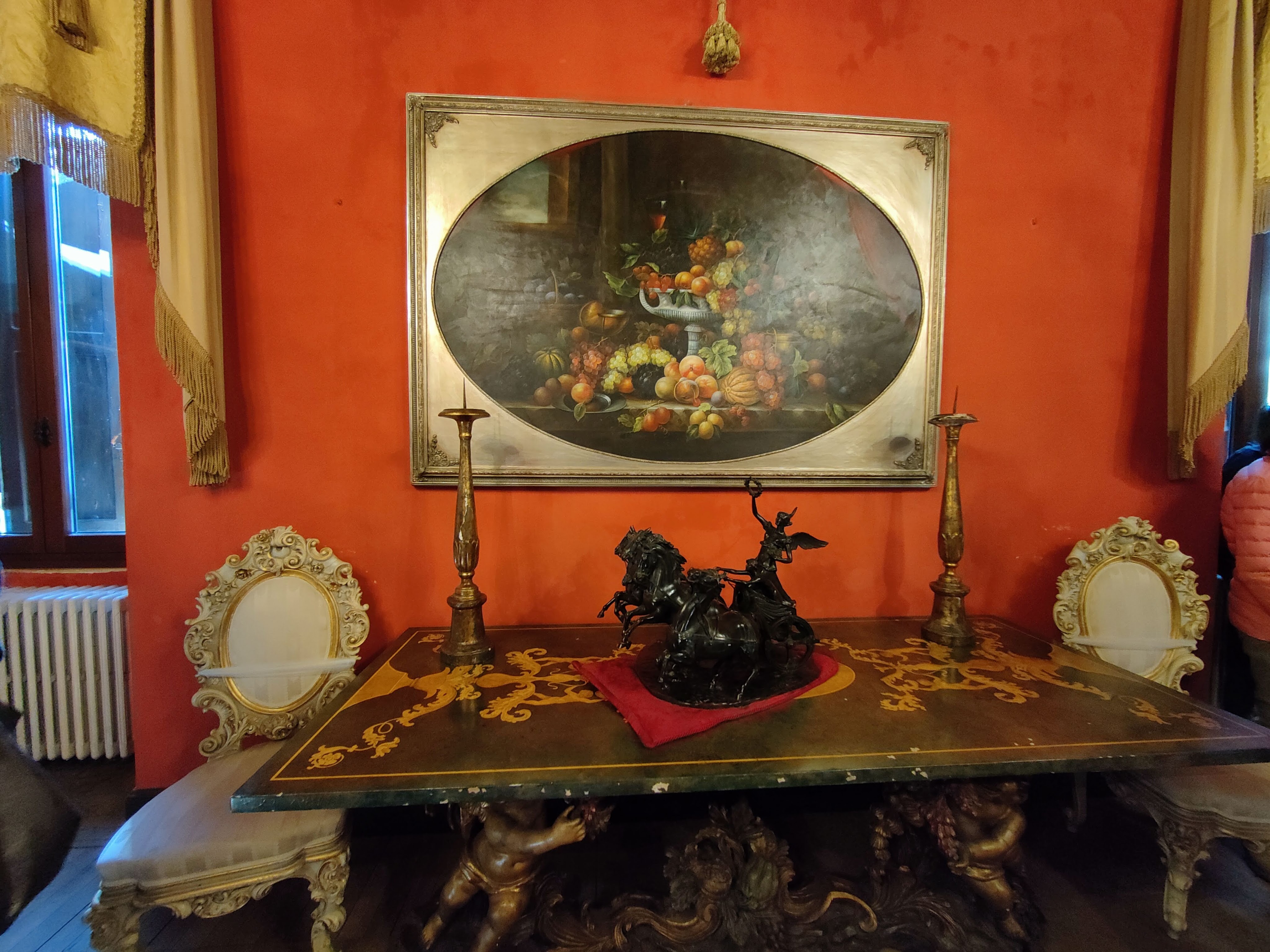 Ci spostiamo in punta di piedi in un altro salone, anche qui lo sfarzo e la ricchezza delle decorazioni e degli arredi ci lascia senza parole. Ancora qualche cenno storico di questo Castello. Nel 1922 la principessa Maria Ruspoli, lo fece restaurare e ne fece una sede di incontri mondani, da qui si spiega la ricchezza degli arredi e il lusso che si propaga da questi saloni storici. ….