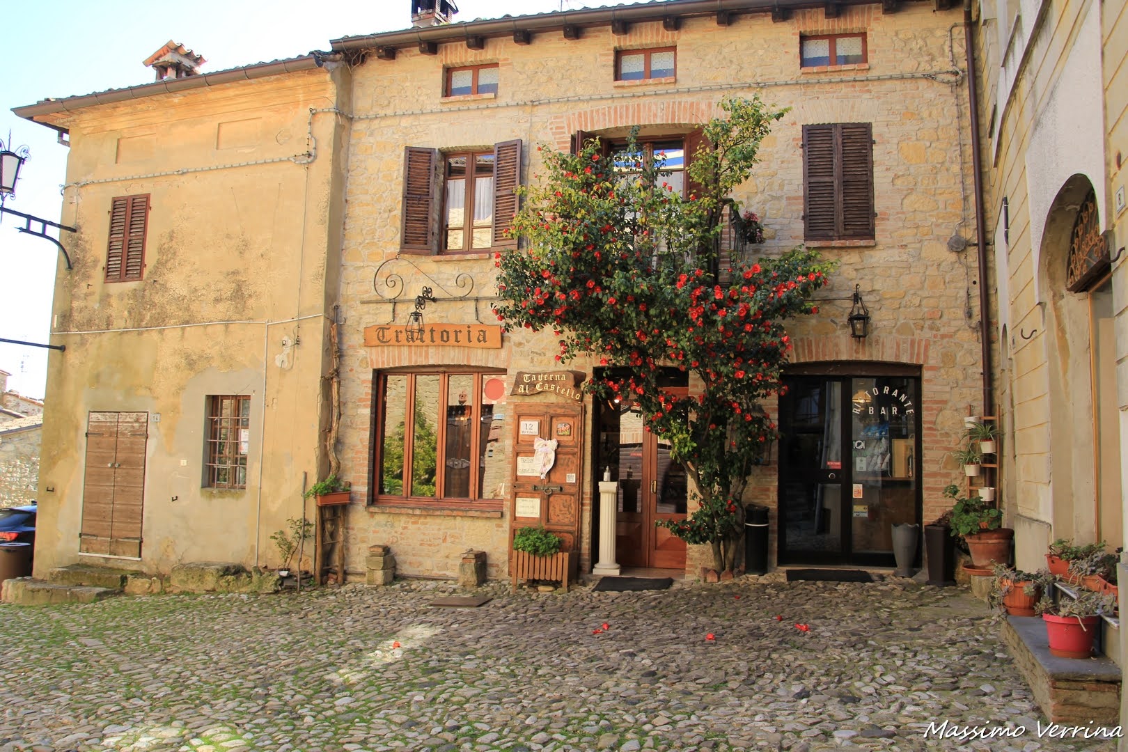 Dopo aver visto in ogni sua parte il Castello, sia dal basso che dall’alto, è giunto il momento di proseguire per i vicoli del borgo andando a scoprire altre meraviglie, e visto che è l’ora di pranzo anche a mangiare. Se vi trovate qui ci sono due trattorie proprio una di fronte all’altra, io sono andato in quella di destra, ho mangiato benissimo, in assoluta tranquillità. Mi hanno fatto salire al primo piano, c’è una sala bellissima affacciata sulla verdissima vallata. Quando ho pranzato io c’erano giusto un paio di persone, una tranquillità unica, come il borgo che state vedendo….