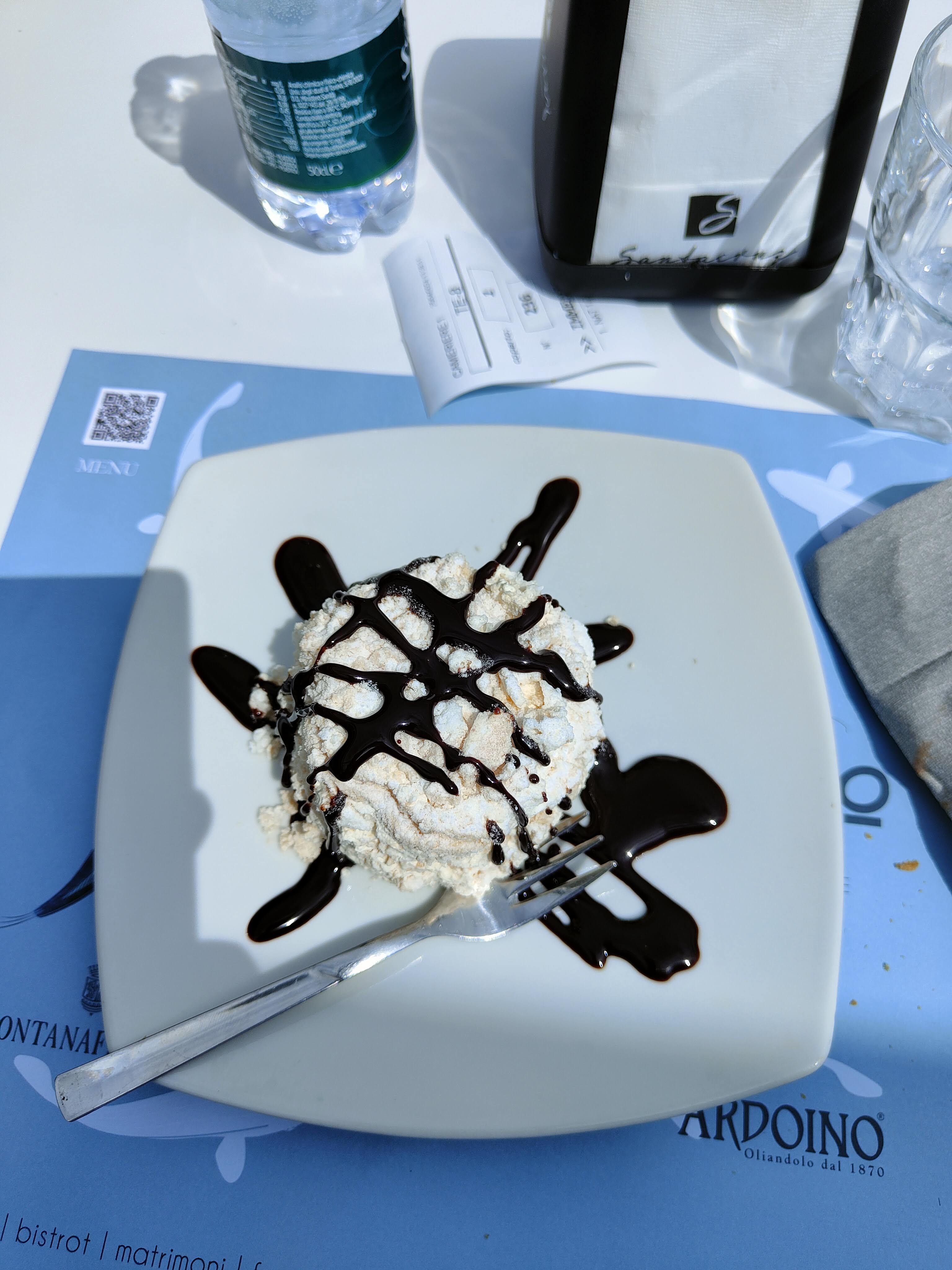 Tralascio il secondo per non perdere troppo tempo, e anche per non appesantirmi troppo, visti i molti km che avrei fatto fino ad arrivare a sera, ma ad un bel dolce non si può dire di no. Ed ecco allora fra i tanti, una bella meringata guarnita col cioccolato, una vera delizia per il palato 😋😋😋😋