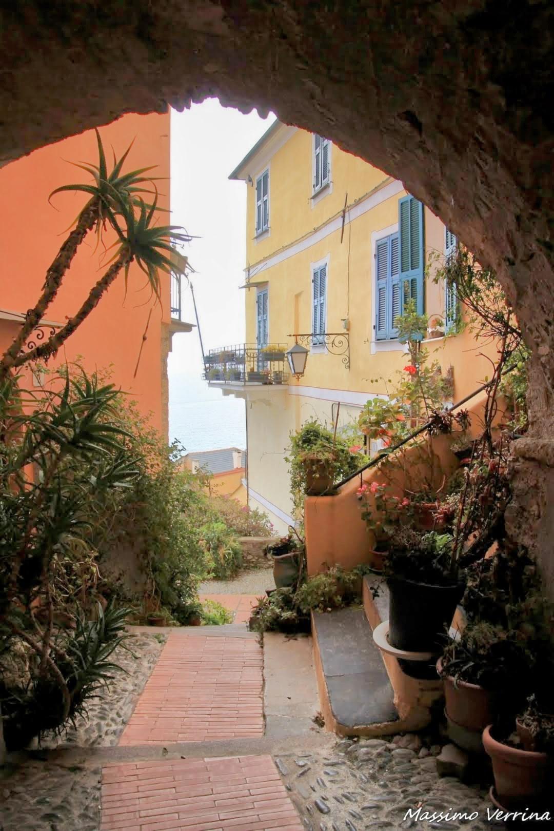 Cominciamo a scendere verso il mare, ogni singolo passaggio è avvolto nel verde, ci sono piante ovunque, potremmo quasi chiamarlo un borgo giardino, per la ricchezza delle piante che s’incontrano durante il cammino….