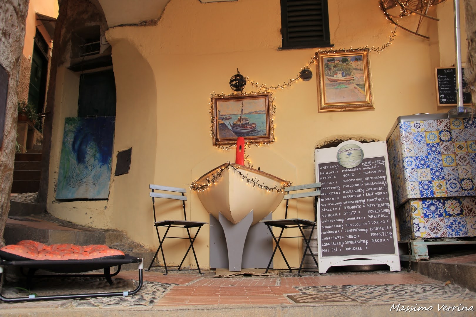Ed è proprio dopo uno di questo vicoletti, vicino alla Chiesa, che troviamo un bar davvero particolare, la scelta dei cocktail qui è davvero vastissima, ma la cosa davvero caratteristica è la presentazione marinara che hanno voluto dare a questo locale, con questa barchetta che sembra uscire dal muro e vari mobili con piastrelle colorate, insomma una vera sciccheria..