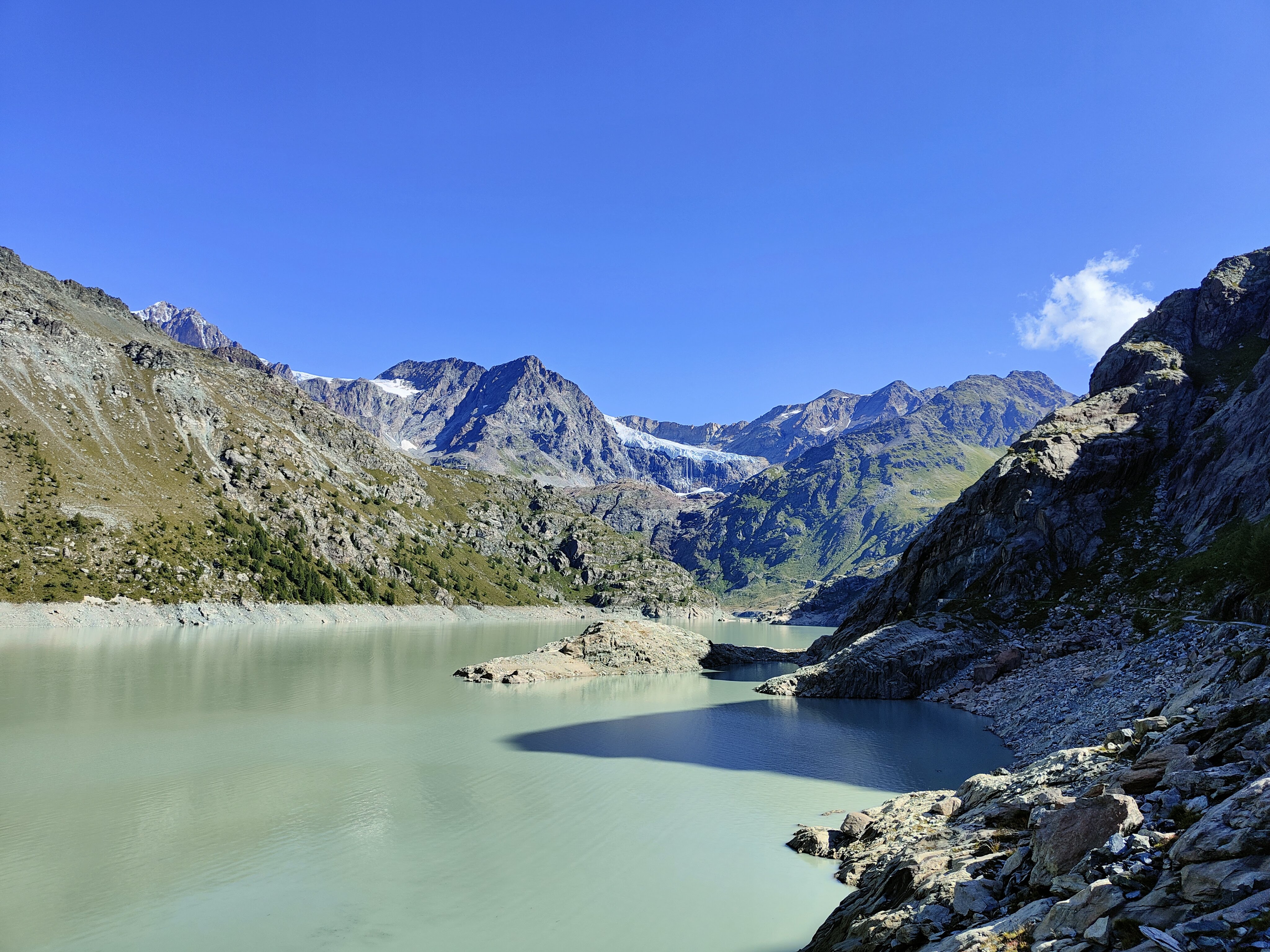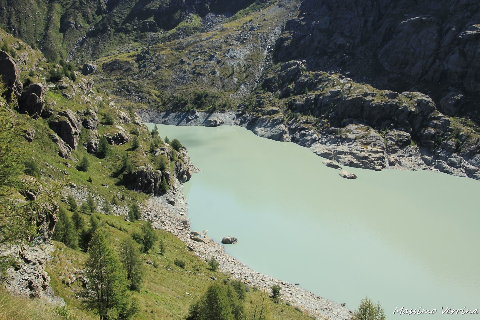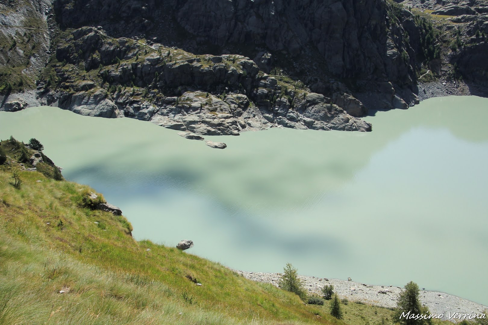 Laggiù, in basso, il lago è una presenza amica, ci fa compagnia per gran parte del primo tratto di percorso. Lo vediamo cambiare colore, ogni volta che l’ombra di una nube corre sulla sua superficie, in un giocoso alternarsi di magica bellezza…