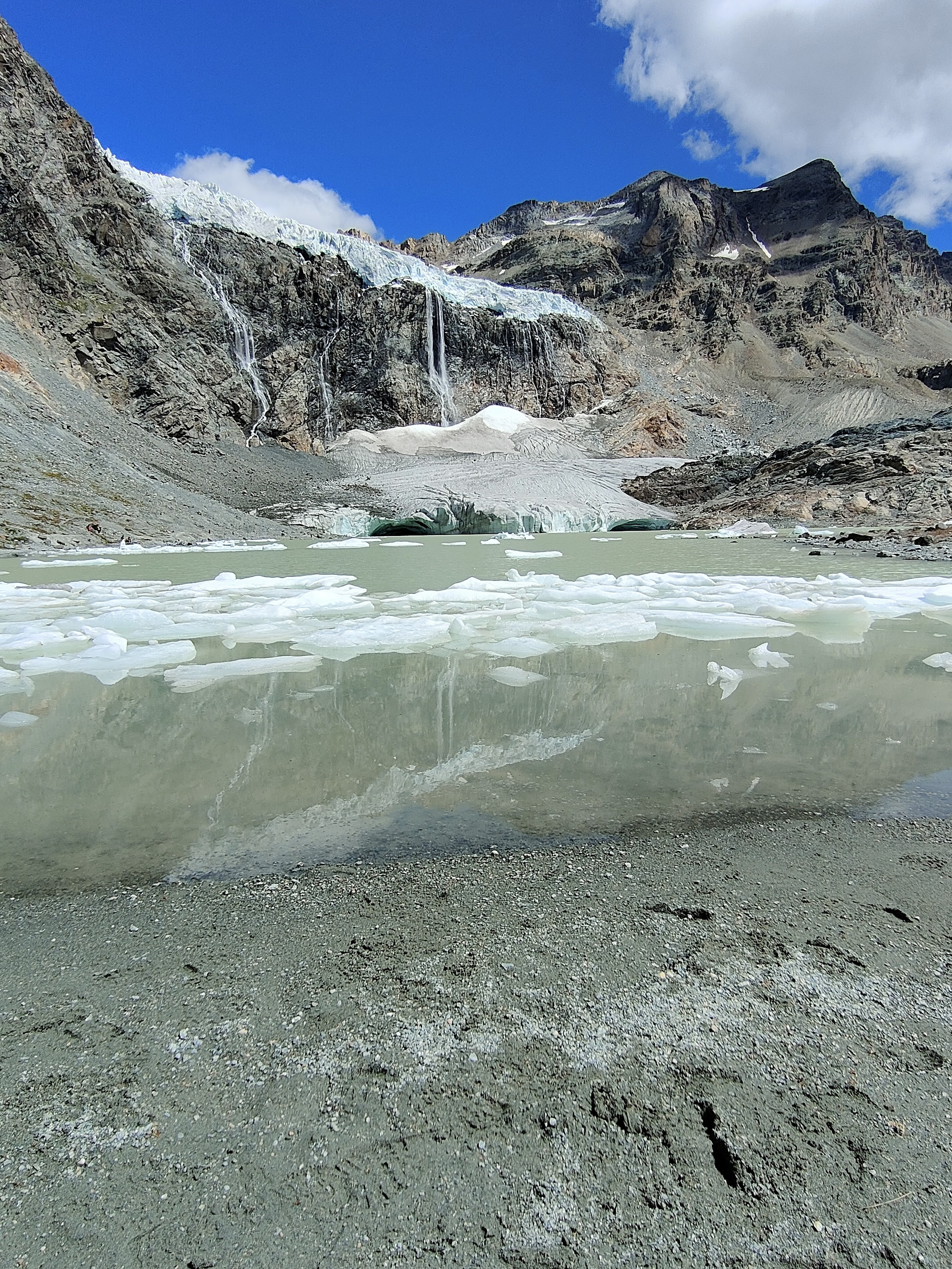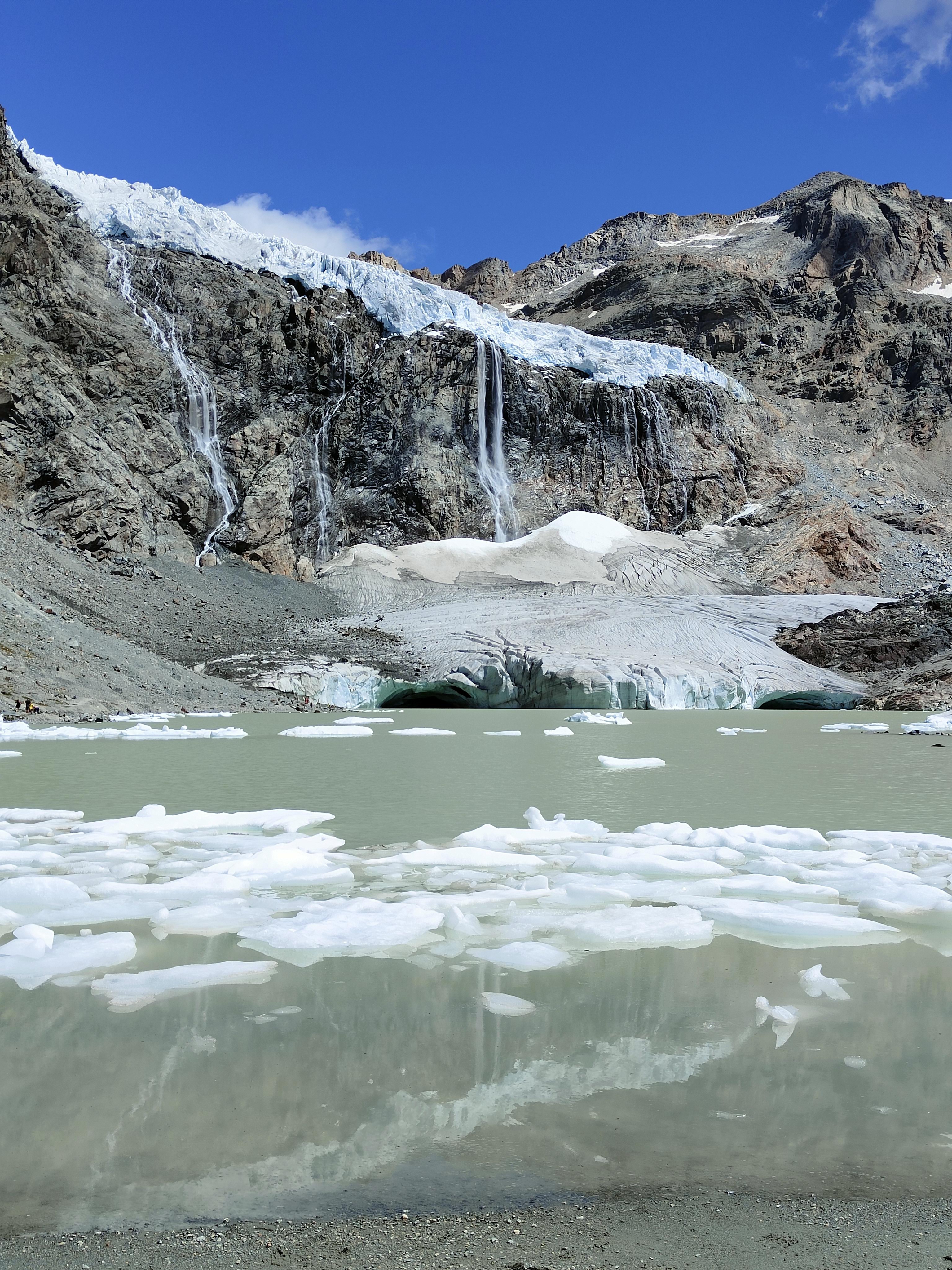 Questo ghiacciaio diviso in tre parti, le due fisse e i pezzi sparsi nel lago a renderlo freddo e statico, ci fa percepire quello spazio in modo molto particolare: freddo di sicuro, ma come se fosse un corpo unico con colori da brividi, direi molto piacevoli per me, che sto qui sudata a ricevere le ondate leggermente più fresche del ventilatore. Non mi sono ancora ammalata con tutte ste correnti., ma direi che l’insieme diventa ottimale, fra ghiacciaio veduto, vento sentito e..mi manca il tatto..pazienza! Intanto leggo le poesie tue che è come se colloquiassi con un viaggiatore che racconta le sue emozioni …tutte suggestioni e grazie a te viaggiatore! buona serata