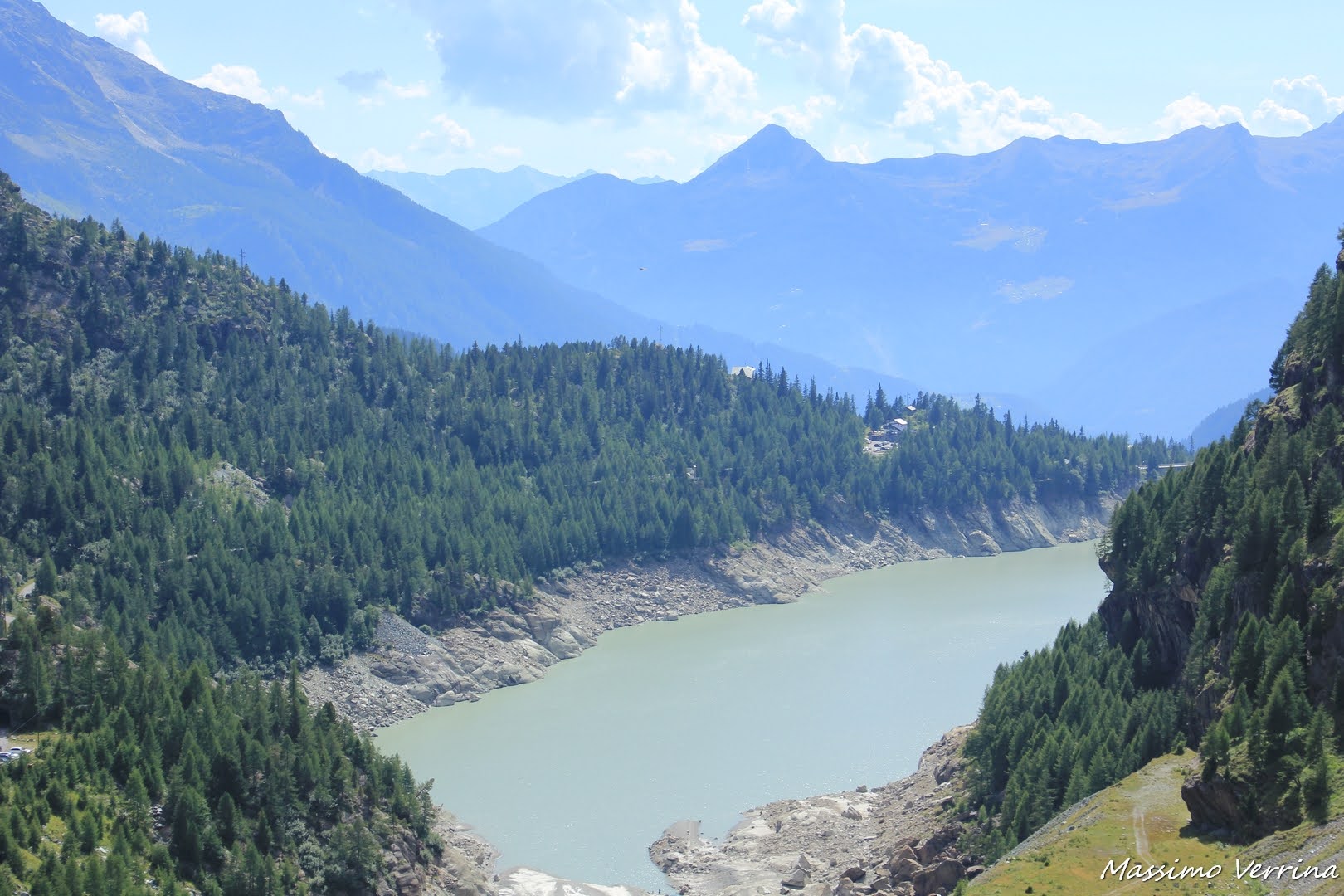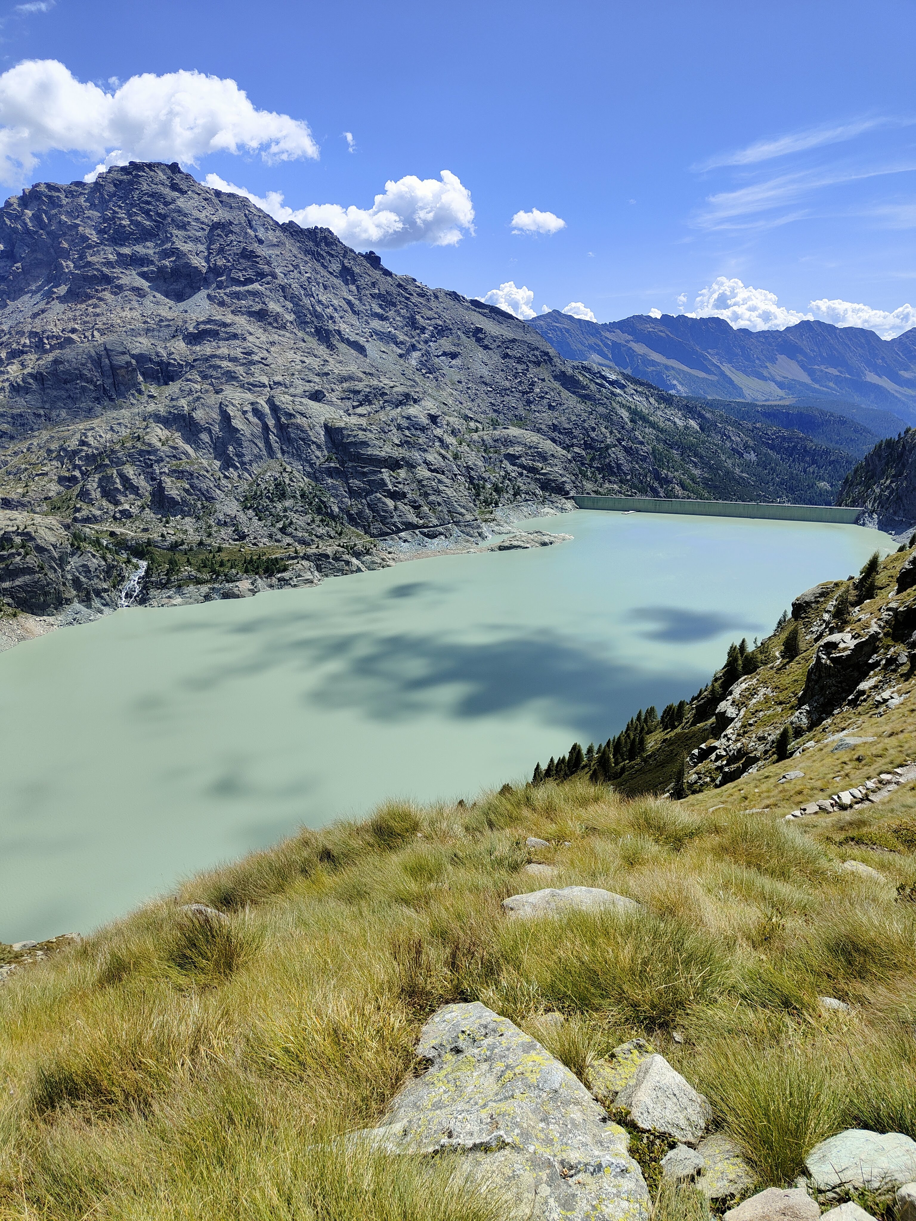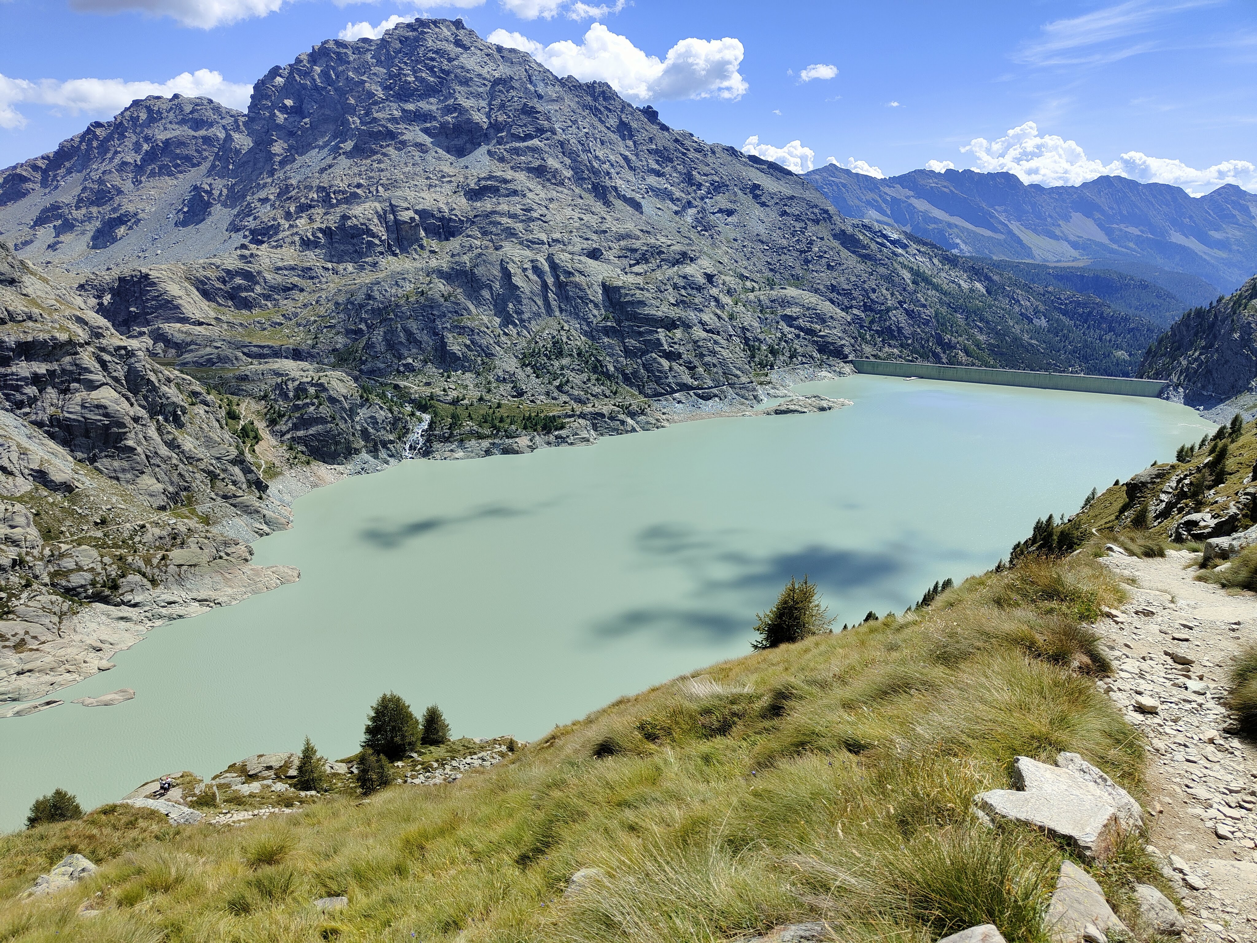 Dopo aver fatto una bella mangiata al Rifugio, non mi rimaneva che scendere a valle, raccogliendo ancora la meraviglia del cammino. Qui la bellezza del sentiero è data dallo spettacolo del lago della diga. Mentre salendo vediamo solo la salita della montagna davanti a noi, durante la discesa il panorama è vastissimo e ci sembra quasi di poter volare su questo paesaggio da sogno…