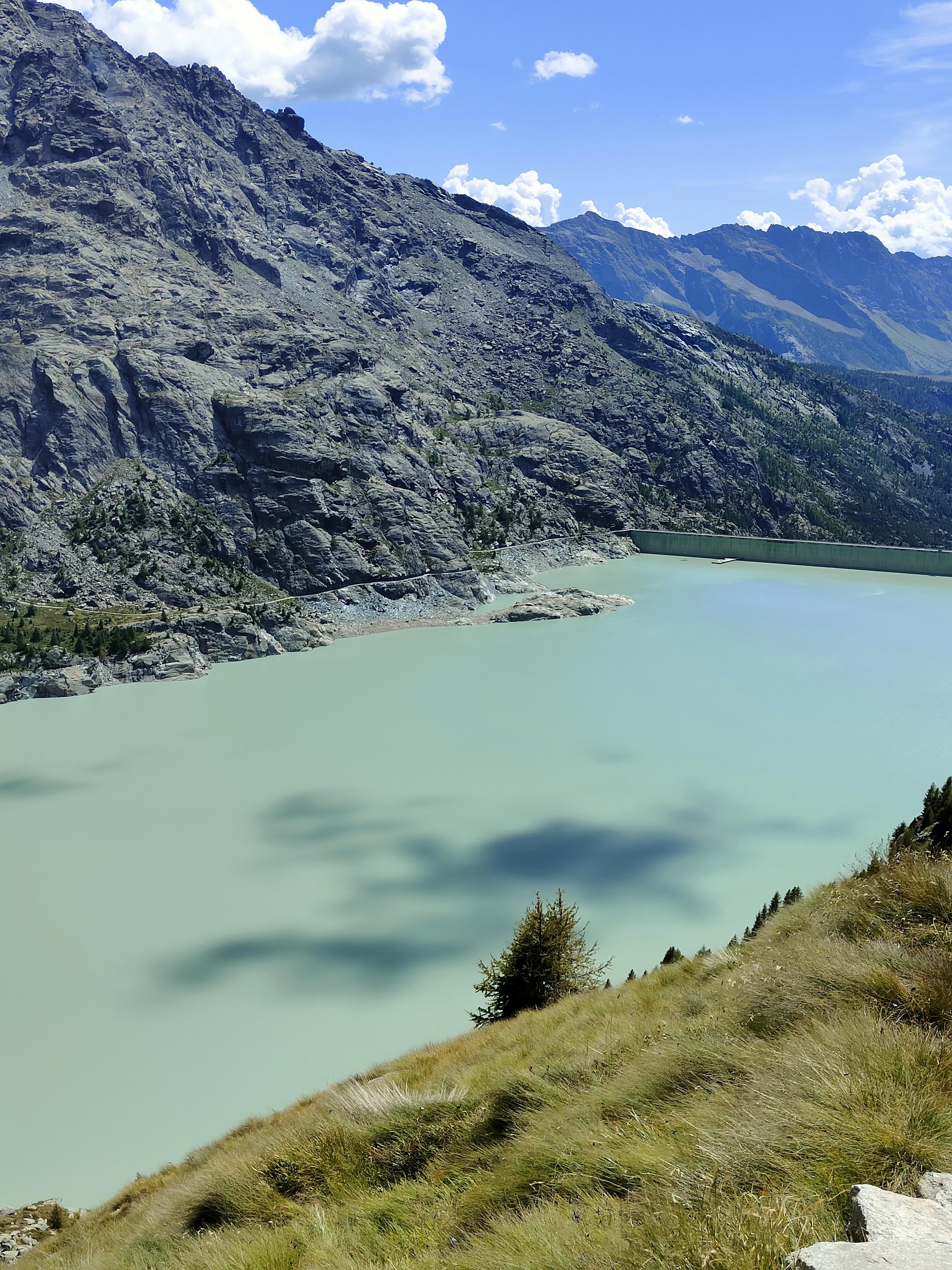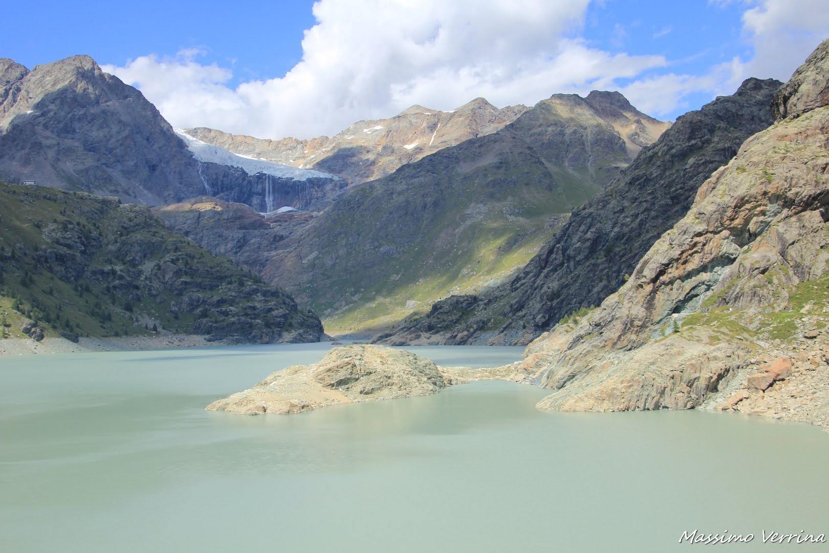Siamo giunti alla diga, da qui il ghiacciaio appena visto sembra salutarci da lontano. Ma la cosa bella di questo paesaggio sono i colori cangianti e sfumati sia del lago che della montagna che lo circonda. Stiamo per andare a vedere l’altro versante del lago, con l’altro sentiero. Da notare anche la roccia a forma di penisola al centro, spettacolo nello spettacolo….