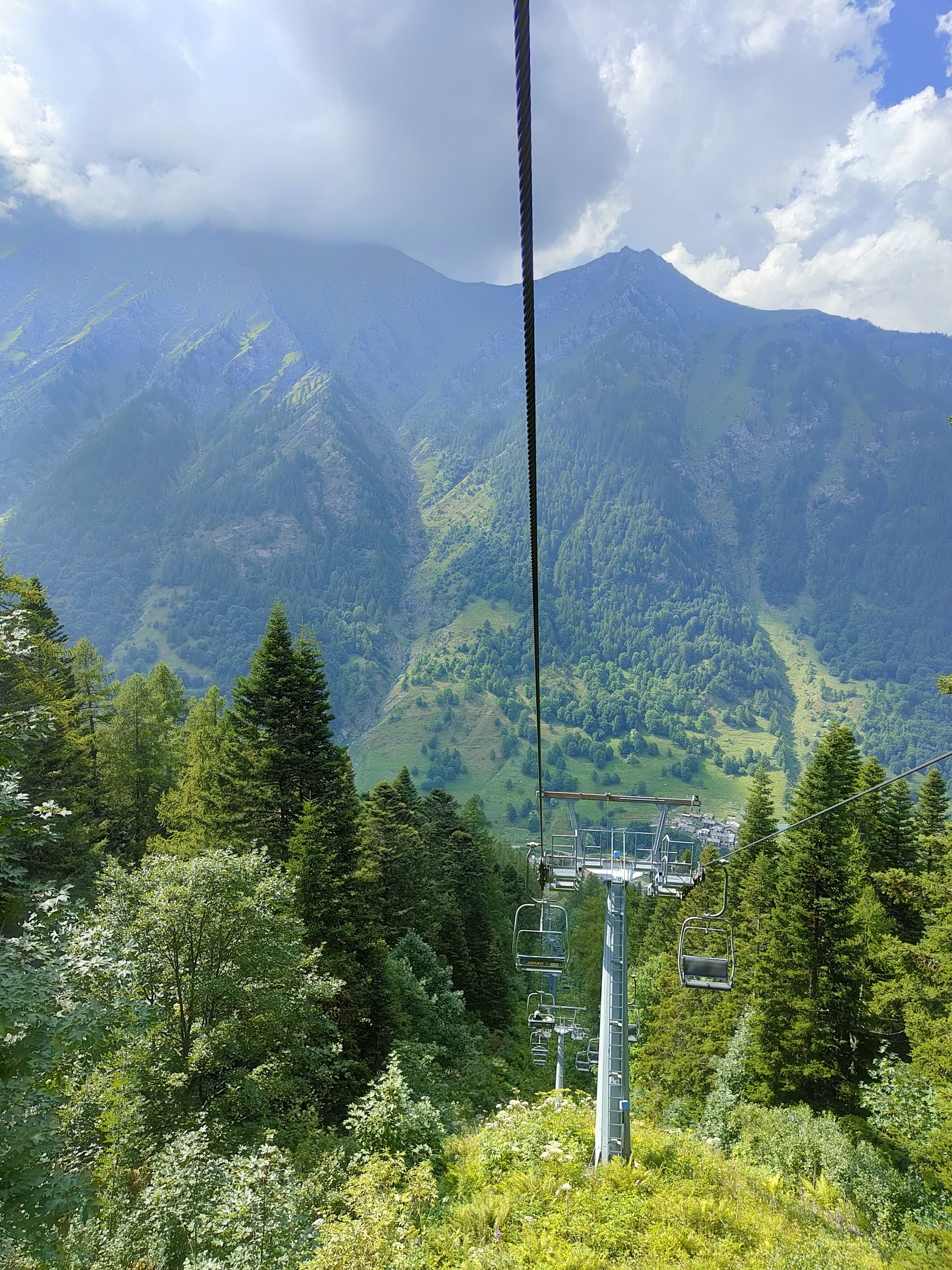 Benvenuti in seggiovia con me, stiamo scendendo verso Prali, i sedili sono umidi, il vento è fresco, a tratti rafficato, accanto a noi si aprono paesaggi meravigliosi, le nostre gambe giocano a sgambettare nel vuoto sotto di noi…