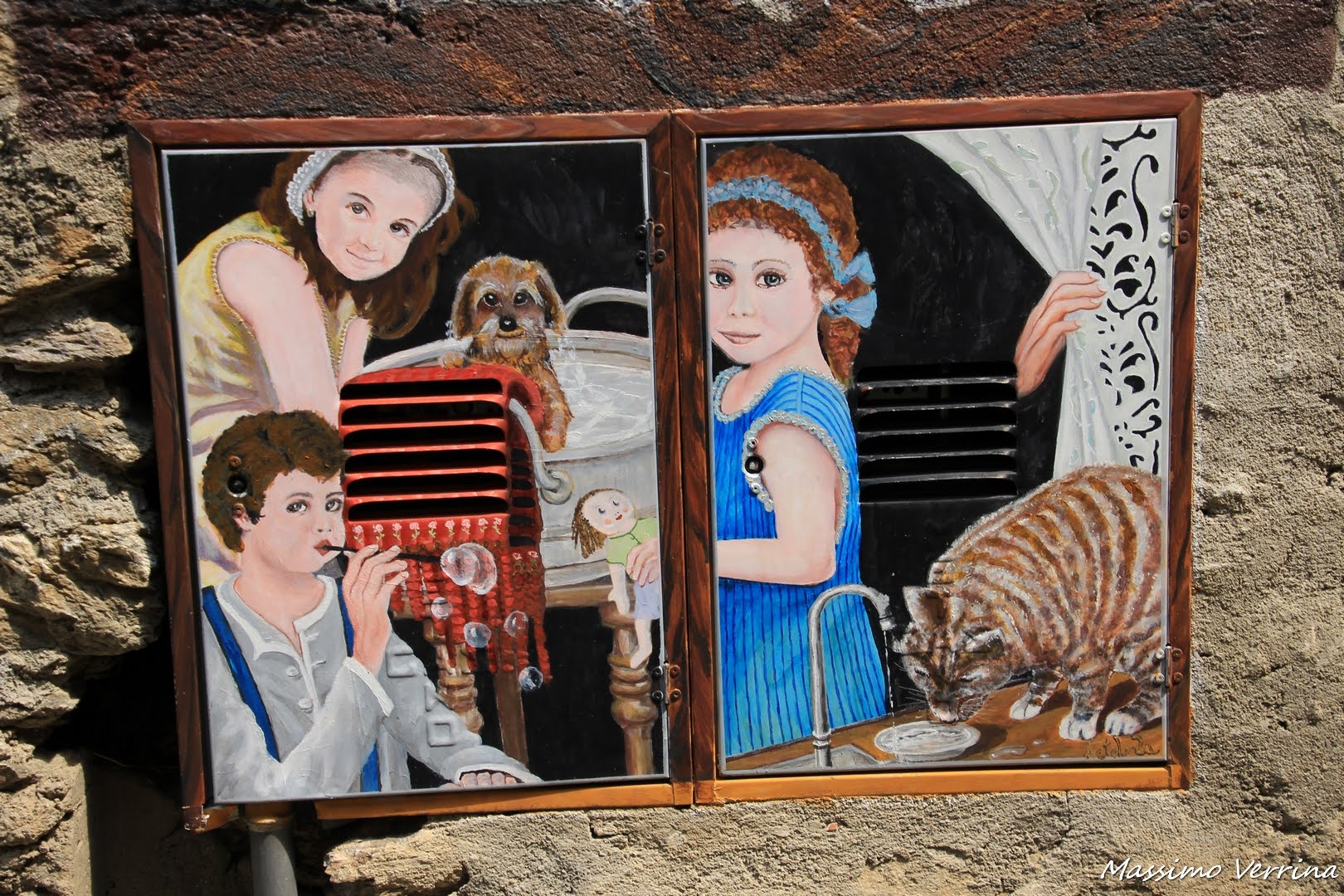 Anche sulle cassette esterne dei contattori del gas e dell’acqua ecco che ritroviamo l’arte. Questi dipinti sono così ben fatti che la funzione di questi sportelli viene praticamente occultata del tutto, facendoci percepire la cura dei particolari e la valorizzazione del borgo stesso che i vari artisti hanno saputo creare all’interno delle sue vie…