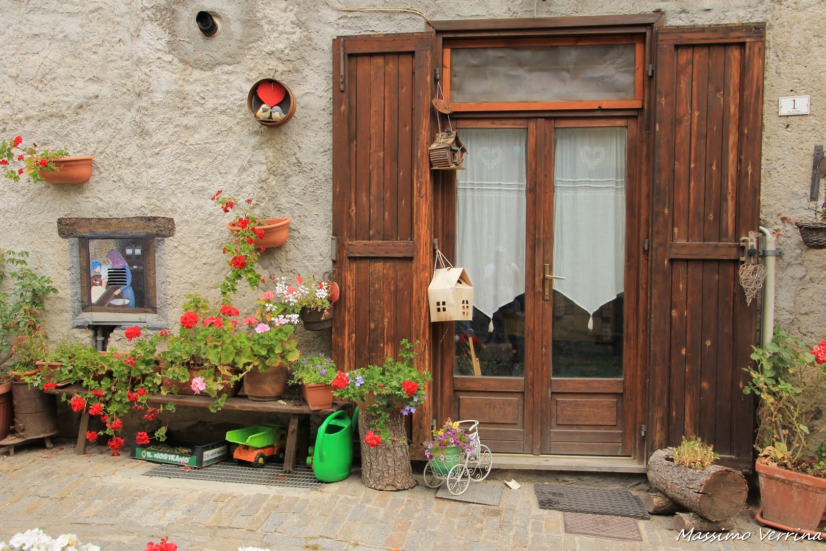 simpatiche decorazioni pittoriche e scultoree in queste casone vecchie con un verde intorno che pare colorari i muri. La statua magari è di un personaggio vissuto veramente lì vista la precisione dei lineamenti… Grazie Max un bellissimo borgo!!