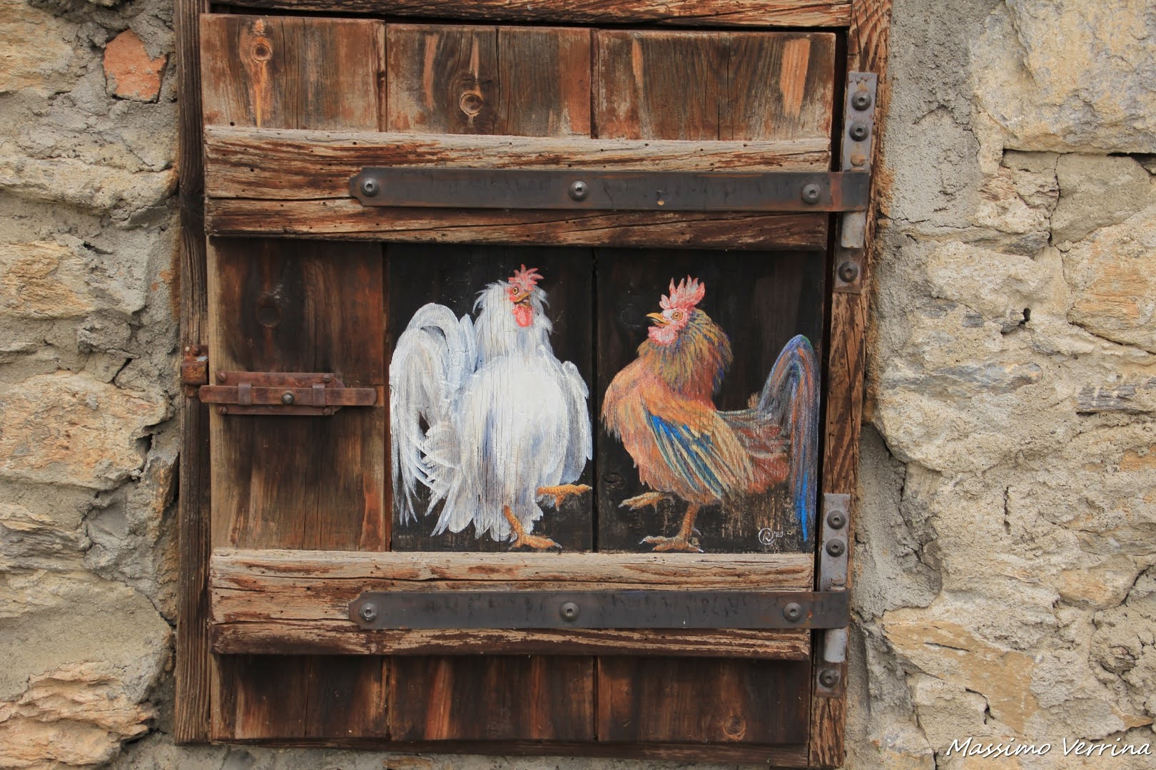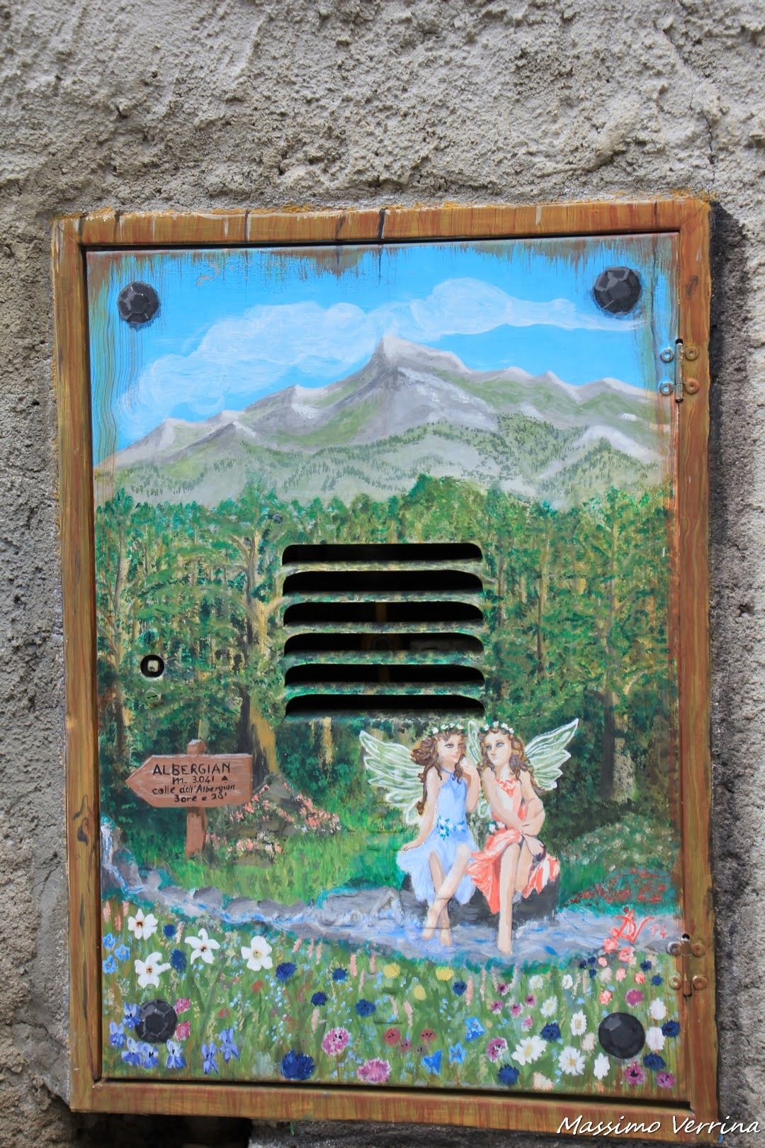 Usciamo da questo locale davvero singolare e torniamo a percorrere le vie del borgo, ecco un altro sportello dipinto, questo ci trasporta nella primavera, la voglia di fare escursioni fra i monti, e quella solare bellezza delle protagoniste, un inno alla bellezza della gioventù e ai valori dell’amicizia …