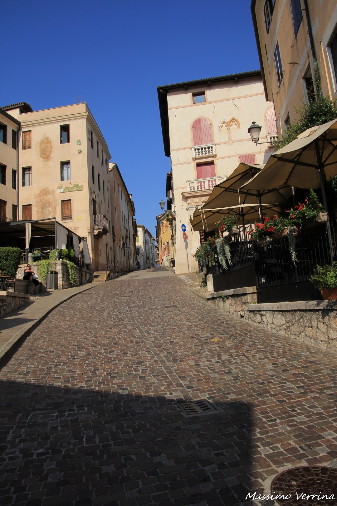 Passato il Ponte degli Alpini, eccoci dinanzi ad una salita che ci porterà a scoprire i molti volti di questa cittadina. Salendo lungo la ripida via, sotto il caldo intenso di agosto, mi fermo di tanto in tanto ad ammirare la varie prospettive delle sue vie, che mi appaiono luminose a ricche di quel fascino che si fa apprezzare al primo sguardo….