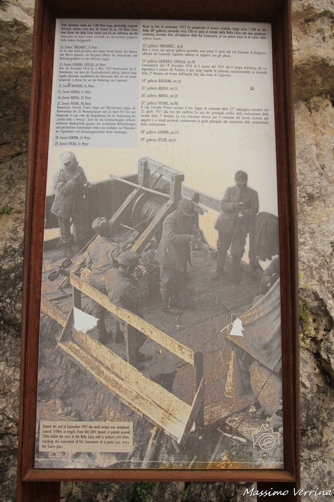 Un altro cartello lungo il cammino ci racconta altre interessanti notizie storiche legate all’anno in cui fu costruita questa Strada, questo percorso oltre alla bellezza in se stessa è un vero Museo a cielo aperto per ricordare la Grande Guerra….