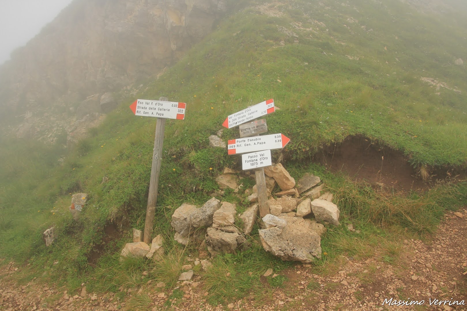 Raggiungo il Passo Val Fontana d’Oro, da qui si aprono altri sentieri, il Rifugio era indicato da due parti diverse, in quanto scendendo sull’altro vallone s’incontrava la strada del ritorno e si poteva comunque raggiungere il Rifugio, ma il percorso completo era quello di sinistra, quindi presi con decisione quel sentiero, continuando a procedere nella fitta nebbia….