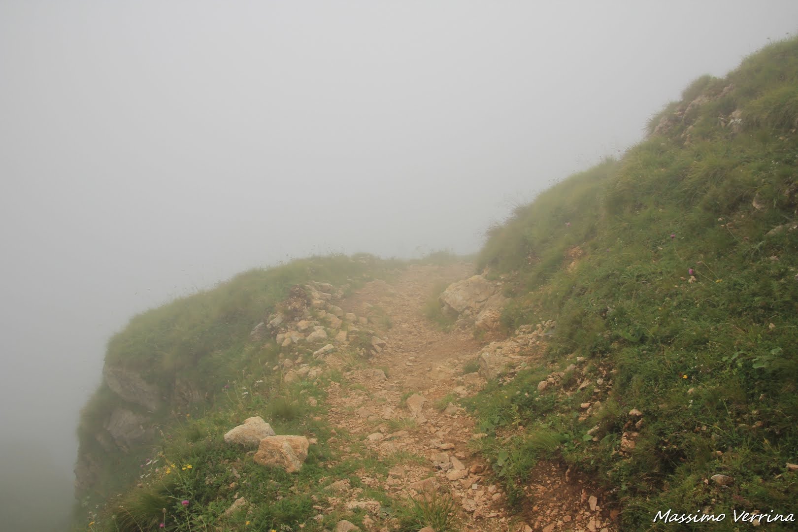 Da qui in avanti il sentiero diventa semi pianeggiante, prima di iniziare a scendere, qua si passa accanto a strapiombi da brivido, al mio fianco ci sono centinaia di metri di vuoto, peccato che con la nebbia fitta sembrava di essere su un piccolo muretto a secco….
