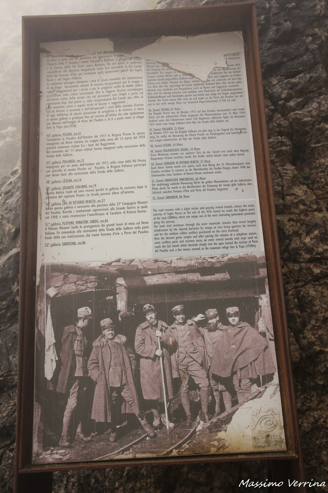 Il prossimo cartello oltre a descriverci lo spettacolo del tratto di strada che stiamo per affrontare, descrive anche le ultime gallerie di questo lungo percorso di salita, come sempre le foto d’epoca aggiungono ulteriore commozione al ricordo di quei valorosi soldati che crearono questa strada….