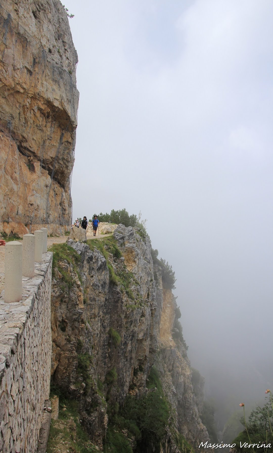 Anche in questo caso, come sul sentiero della salita, sotto di noi si aprono passaggi verticali da brivido, ve ne faccio vedere giusto uno dal ciglio della strada, da un piccolo sperone roccioso….