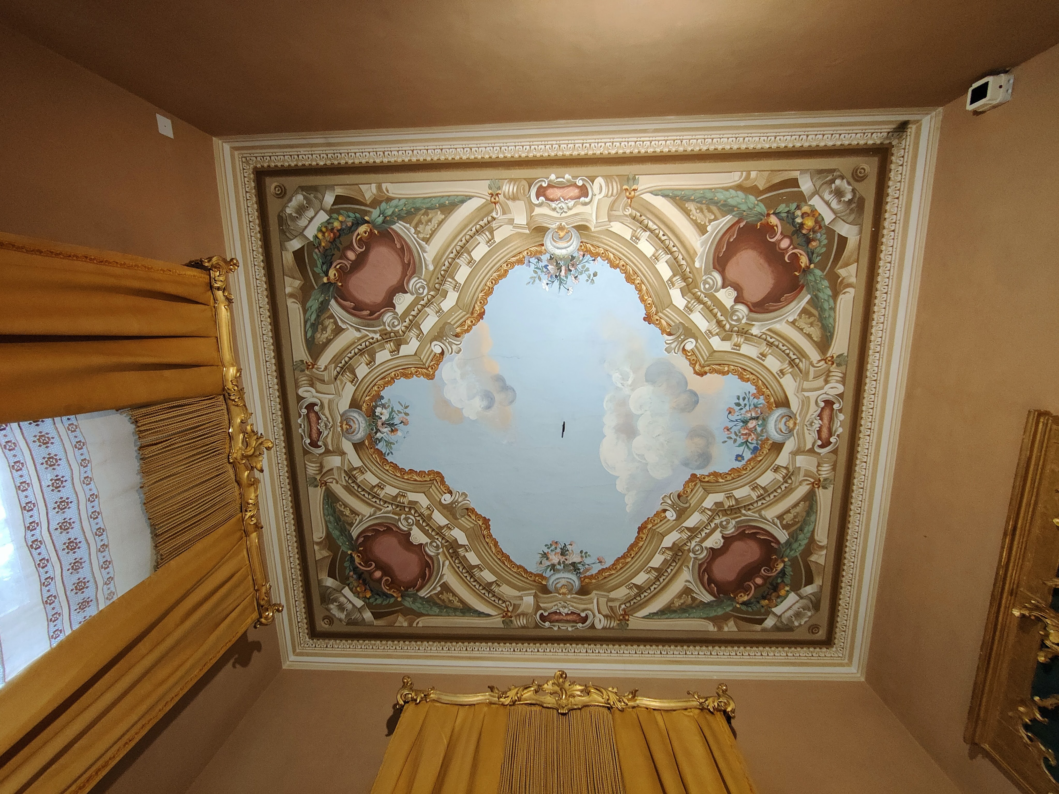 Anche i soffitti di queste sale sono molto interessanti, questo in particolare ci fa vedere uno spaccato di cielo, con tanto di nuvole e un uccello che attraversa la scena. E’ così ben fatto che ci sembra quasi una fotografia, il colpo d’occhio quando alziamo gli occhi in alto è assicurato…